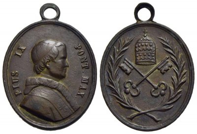 | Medaglia ovale coniata, probabilmente emessa nel 1846 a ricordo dell'elezione al pontificato di Pio IX. | |||||||||||