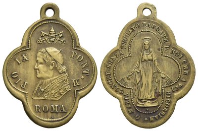 | Medaglia devozionale coniata quadrilobata, senza data ma probabilmente realizzata nel 1854 per ricordare la Proclamazione del Dogma dell'Immacolata Concezione di Maria. | |||