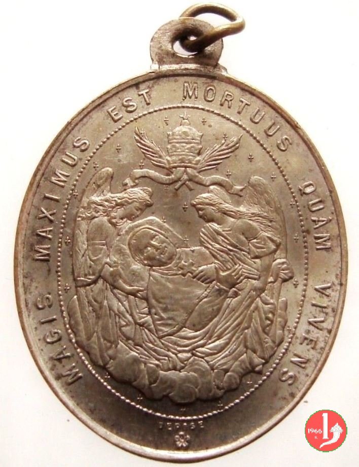 entro ovale perlinato: Triregno su piume decussate sormonta Angeli che alzano verso il cielo la Salma del defunto Papa Pio IX