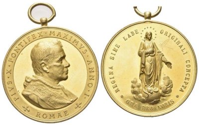 | Medaglia coniata, emessa nel 1904 per ricordare la promulgazione dell'enciclica Ad Diem Illum, per celebrare il cinquantenario del Dogma dell'Immacolata Concezione della B. V. Maria. | ||||||