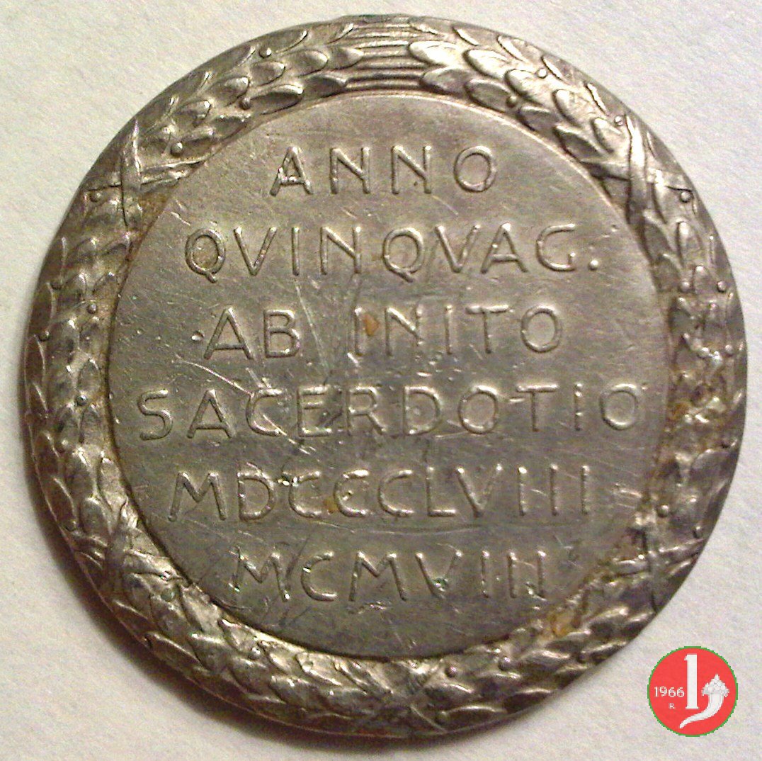 Medaglia coniata, emessa il 18-09-1908, con fondo opaco, a ricordo del Giubileo sacerdotale di Pio X. | |||||||||||