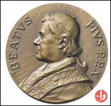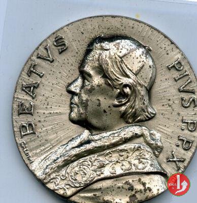 Medaglia coniata, realizzata nel 1951 con fondo opaco dallo Stabilimento A. E. Lorioli di Milano, a ricordo della Beatificazione di Pio X.
