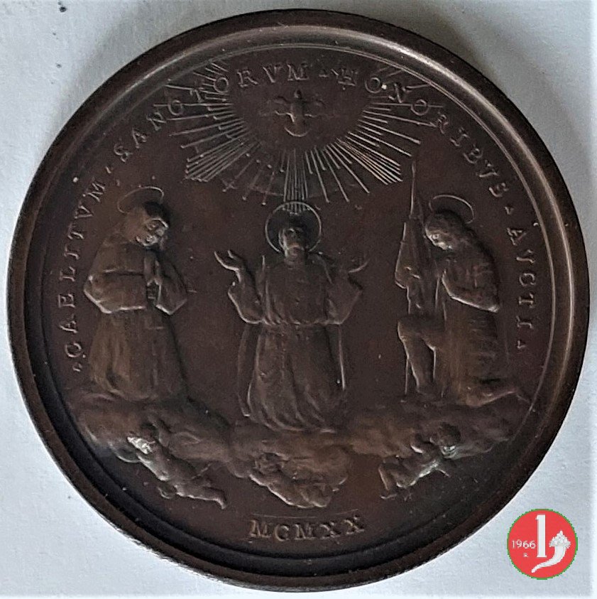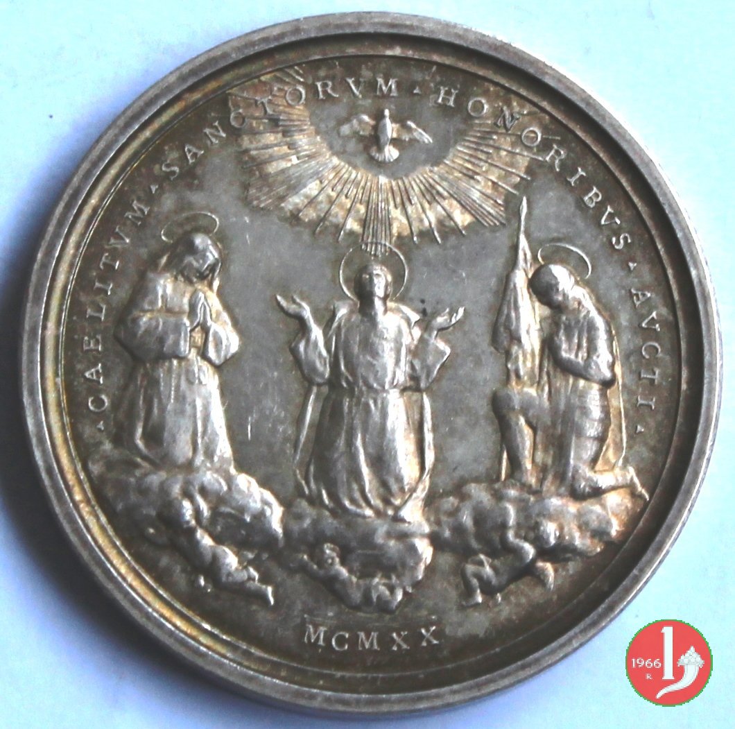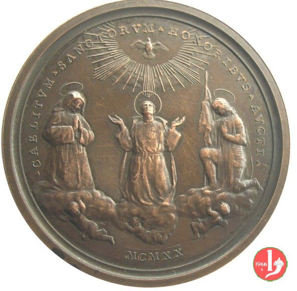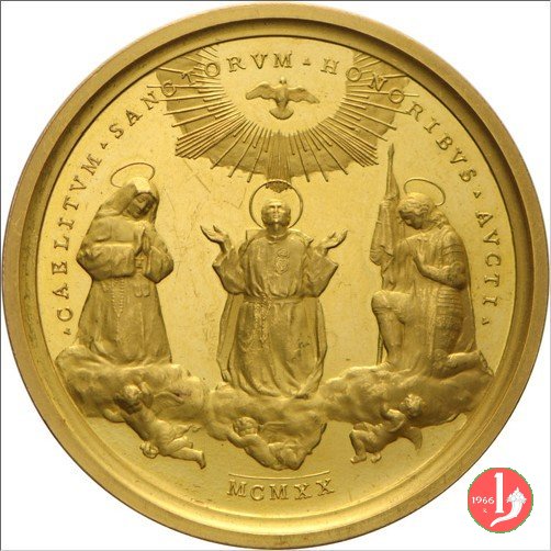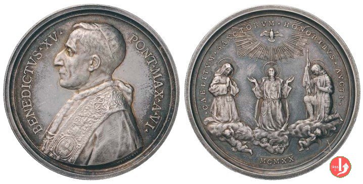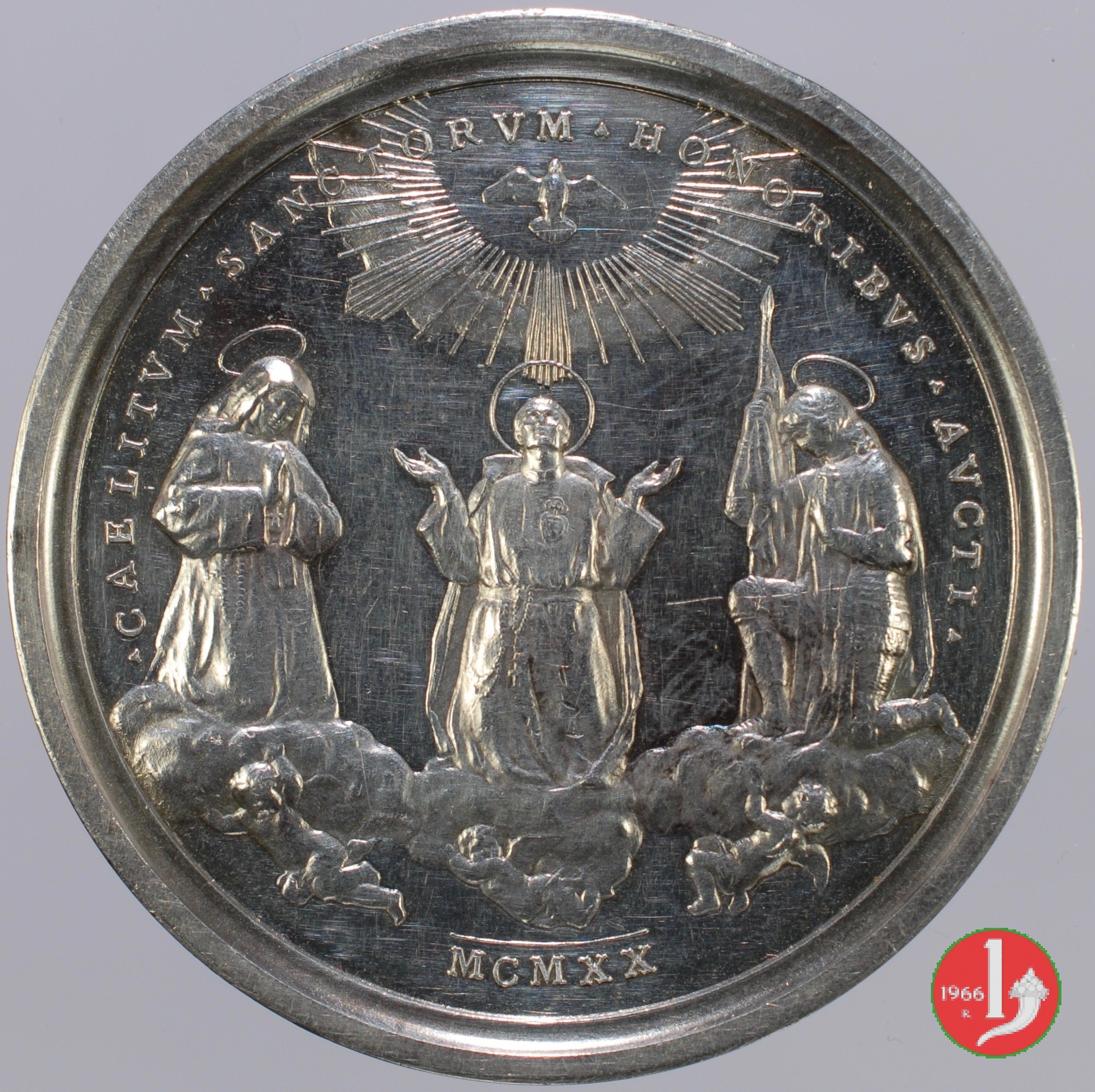 | Medaglia annuale, coniata con fondo lucido, emessa il 29-06-1920 a ricordo della Canonizzazione di Giovanna D'Arco, Margherita M. Lacoque e Gabriele Dell'Addolorata. | ||||||||