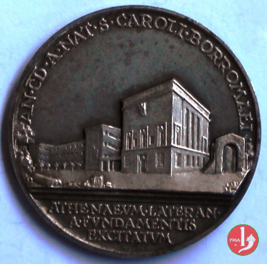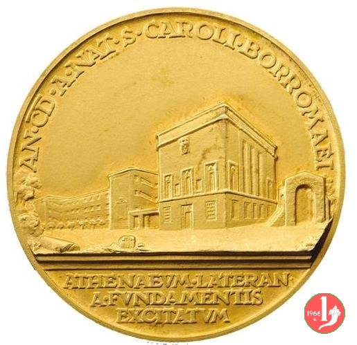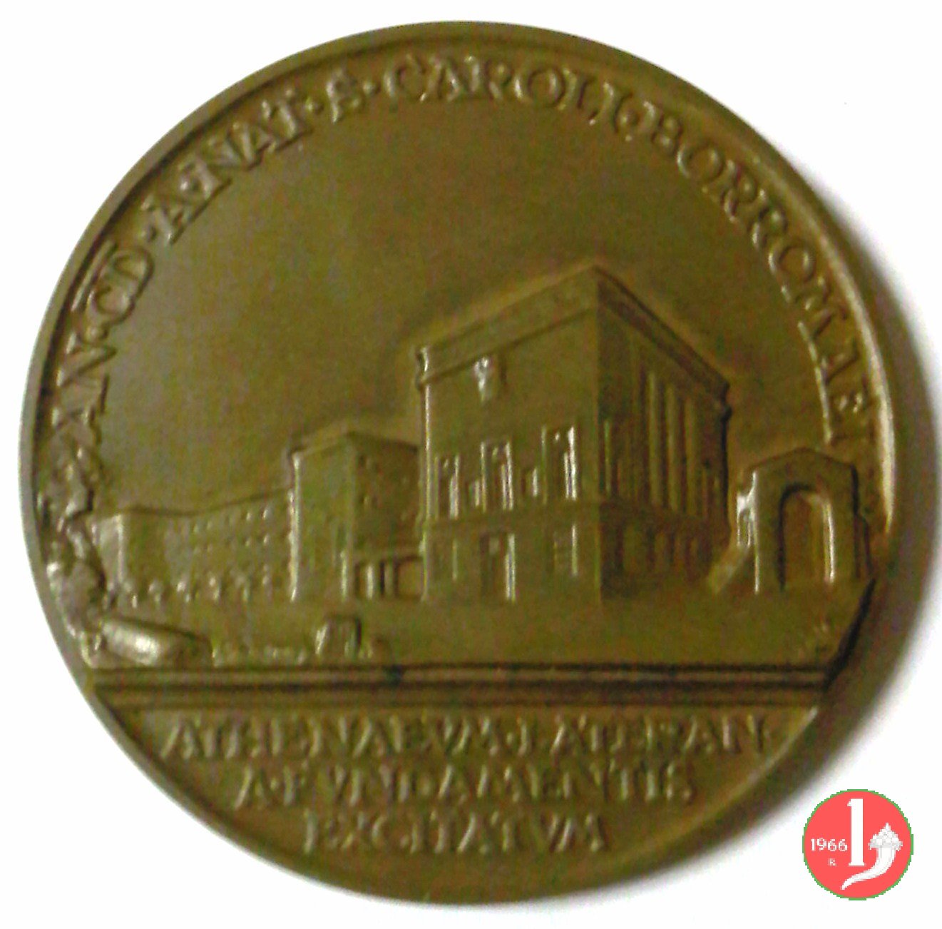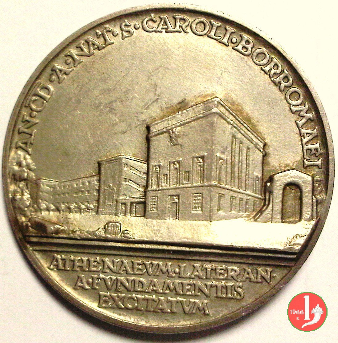 Medaglia annuale coniata, emessa il 29-06-1938, con fondo opaco dalla Regia Zecca Italiana, a ricordo della nascita di San Carlo Borromeo e della Costruzione del nuovo Ateneo Lateranense.