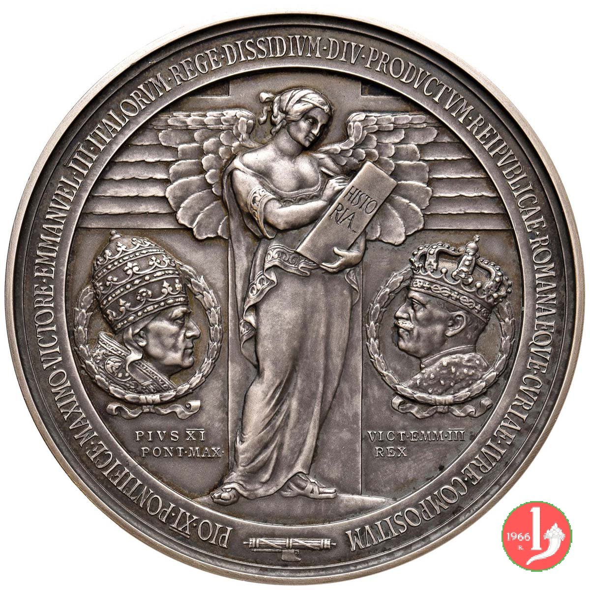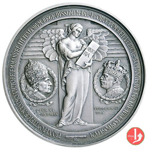 busti affrontati entro cornone di Pio XI con triregno e di Vittorio Emmanuele III con corona, al centro figura allegorica della storia alata scrive su libro titolato: HISTO = RIA