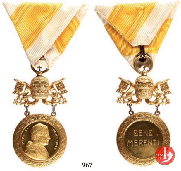 Medaglia premio coniata senza data, sorretta da triregno su chiavi decussate, emessa con fondo lucido. La presente medaglia era distribuita con due appiccagnoli legati a triregno su chiavi decussate, retto da nastro bianco e giallo. | ||||||||||||||||