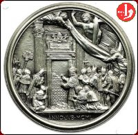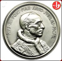| Medaglia straordinaria coniata, emessa nel 1950, con fondo opaco, dallo Stabilimento Stefano Johnson di Milano, a ricordo dell'Anno Santo. | ||||||