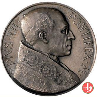 | Medaglia straordinaria coniata, emessa nel 1950, con fondo opaco dallo Stabilimento Emilio Pagani di Milano, per ricordare l'Anno Santo. | ||||||