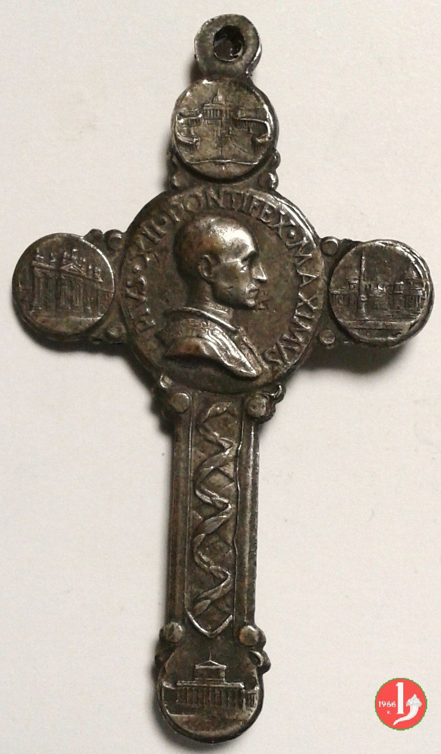 Croce coniata, emessa per ricordare il l'Anno Santo. Composta da medaglia centrale e quattro medagliette agli estremi dei bracci. | |||