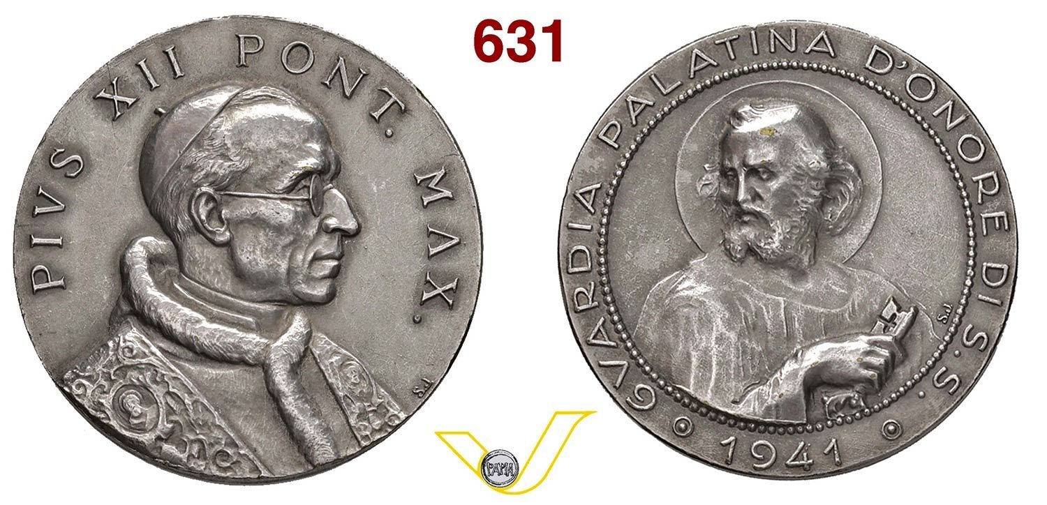 | Medaglia premio annuale coniata, emessa il 06-07-1941, realizzata con fondo opaco dallo Stabilimenti Stefano Johnson di Milano, per il Corpo Armato Pontificio della Guardia Palatina d'Onore, distribuita per la festa annuale del corpo. | |||||||
