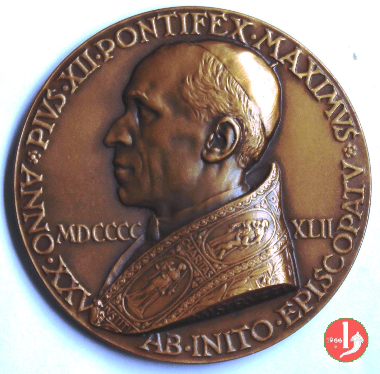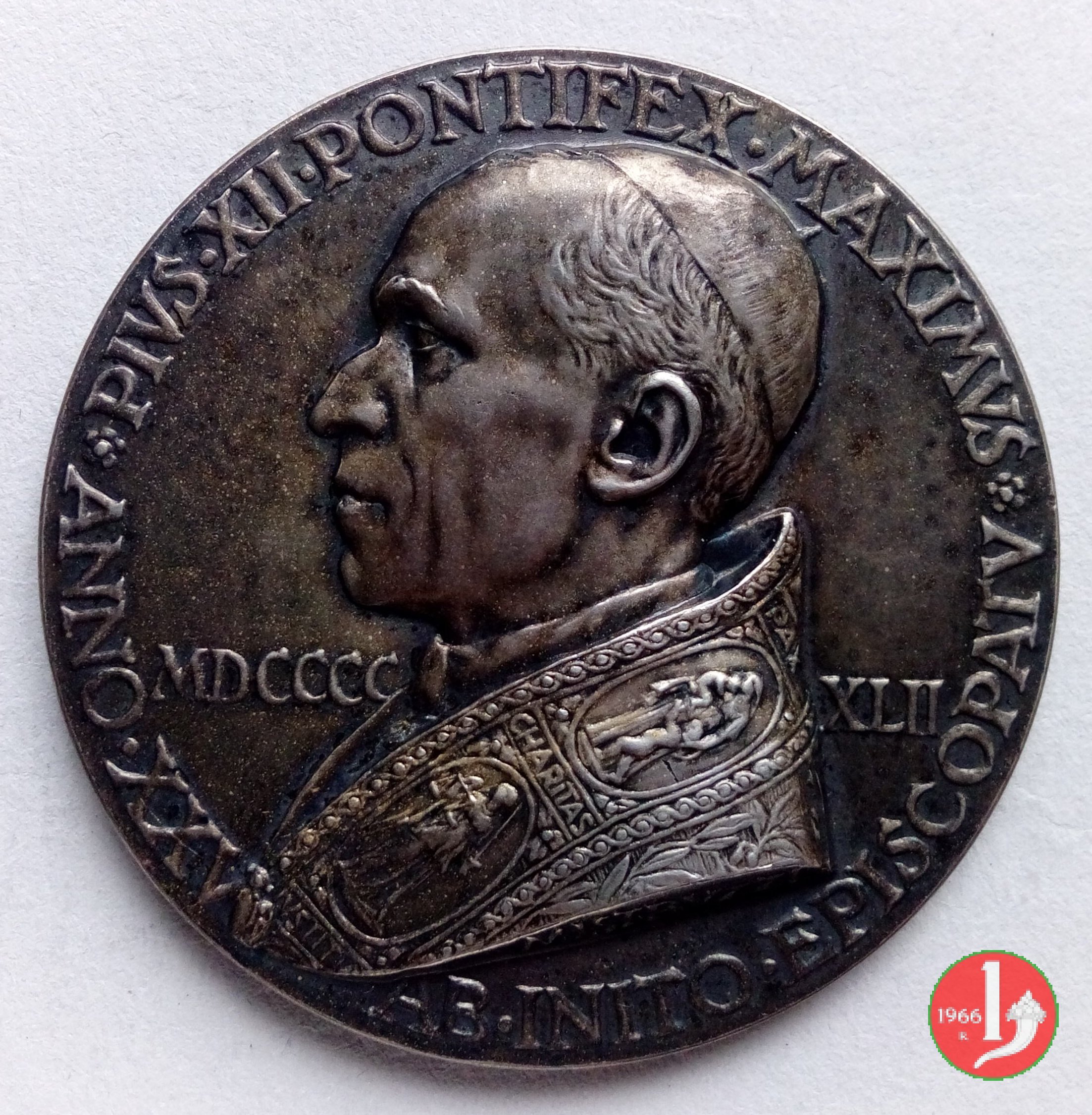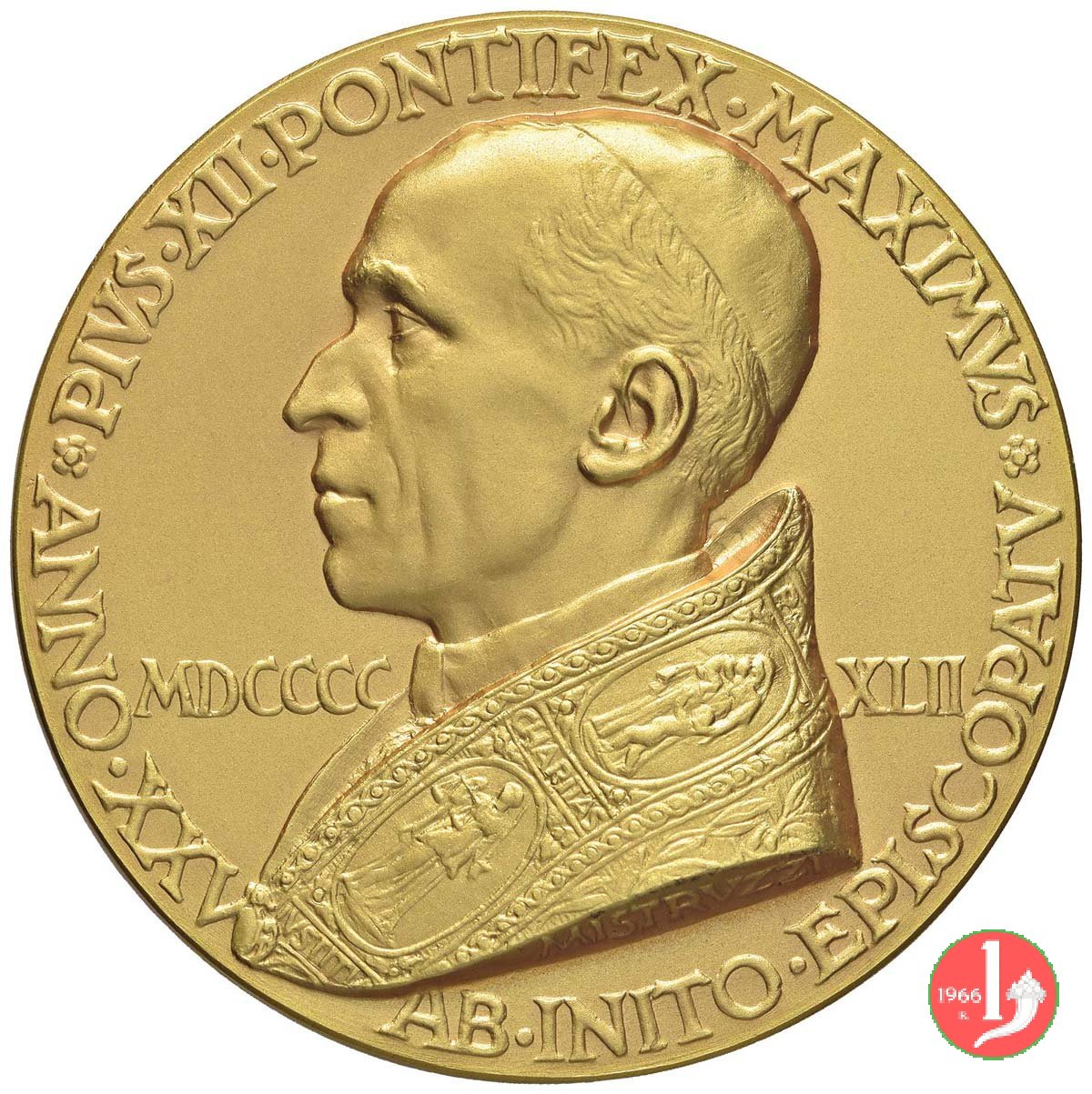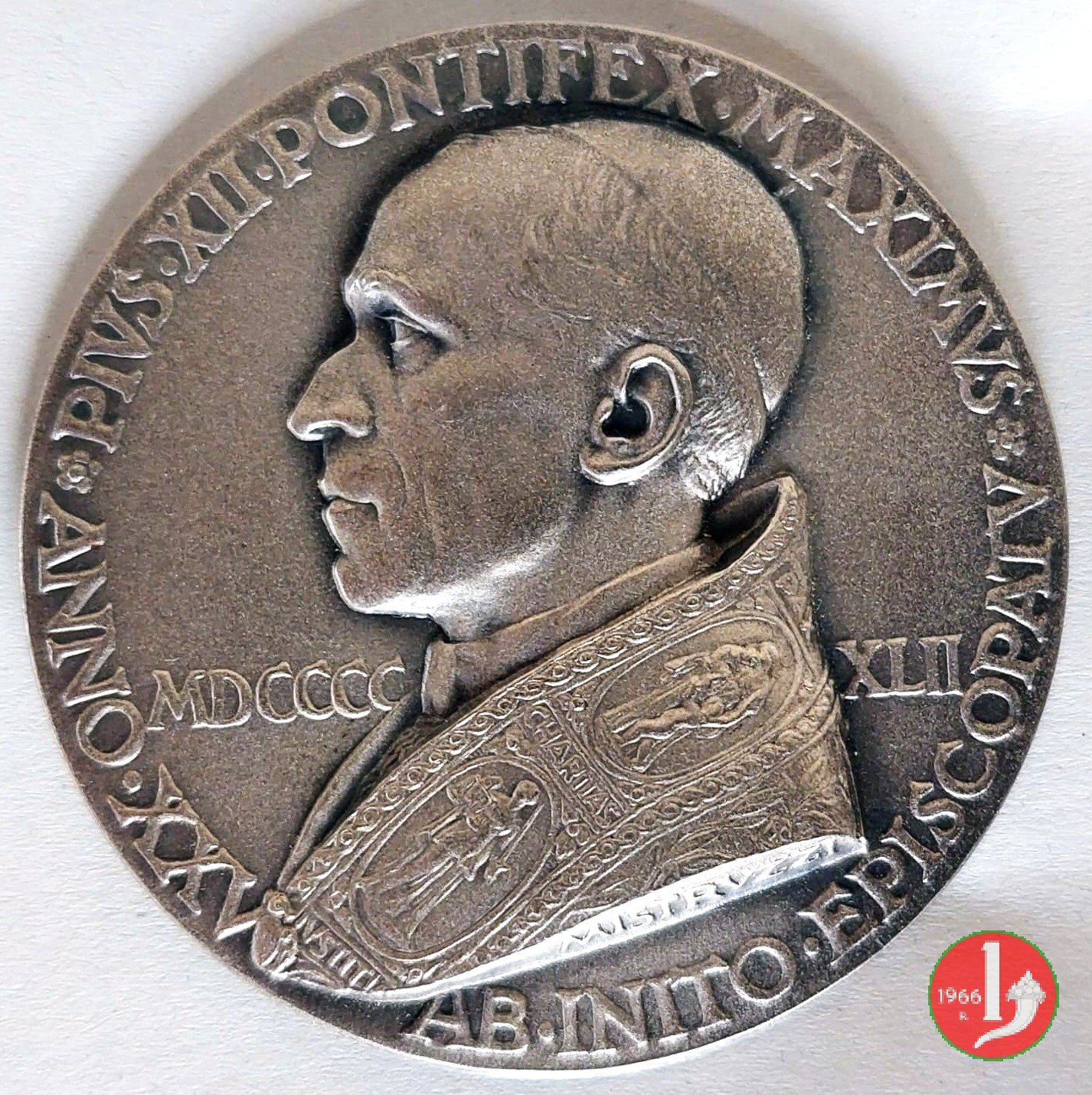Medaglia straordinaria coniata, emessa il 13-05-1942, con fondo opaco dallo Stabilimento F. M. Lorioli F.lli di Milano, a ricordo del Giubileo Episcopale del Papa.