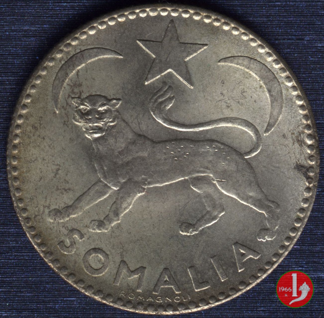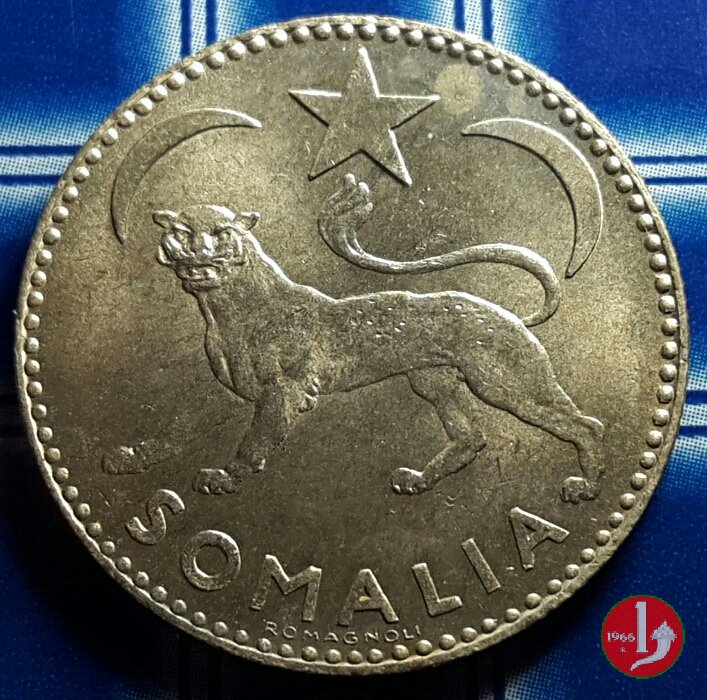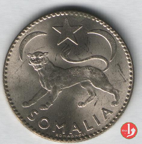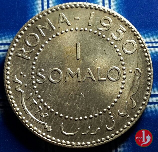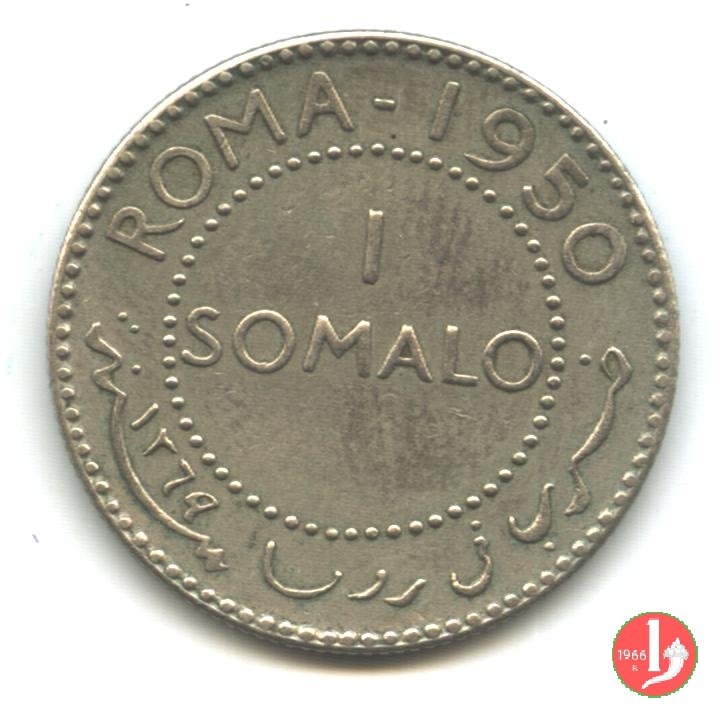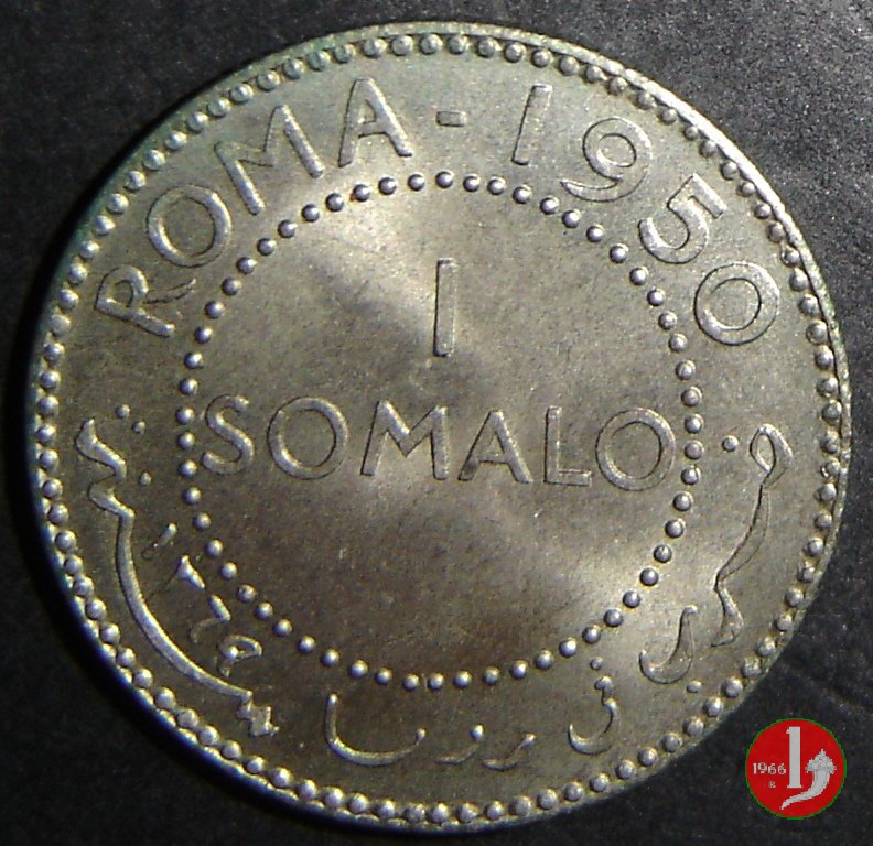 Leopardo sormontato da stella a 5 punte e due mezzelune. Sotto la scritta SOMALIA. Nel campo, all'interno di un cerchio, l'indicazione del valore (1 SOMALO) su due righe. Intorno, nella parte inferiore le indicazioni in arabo, nella parte superiore la scritta ROMA 1950.