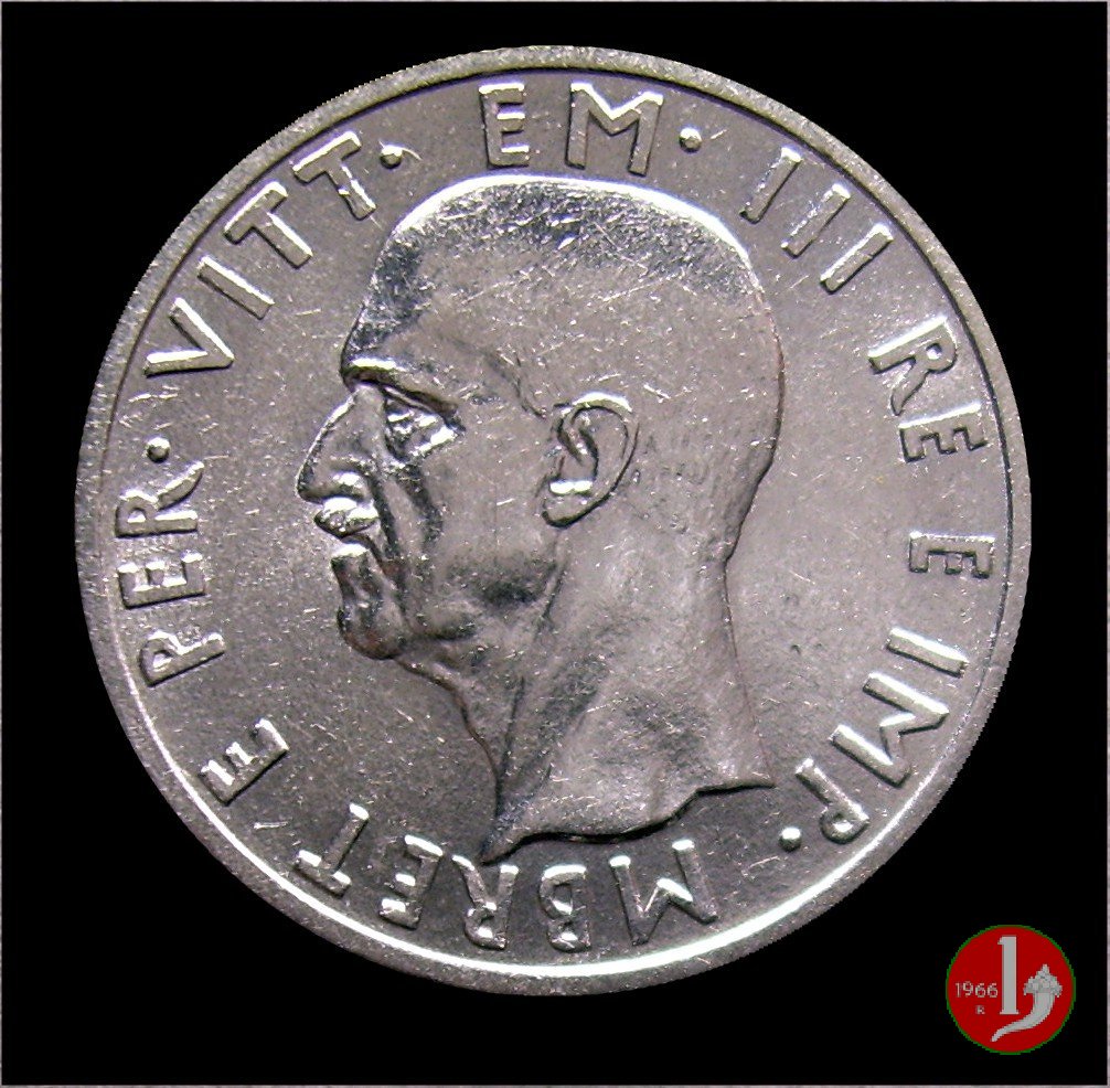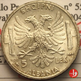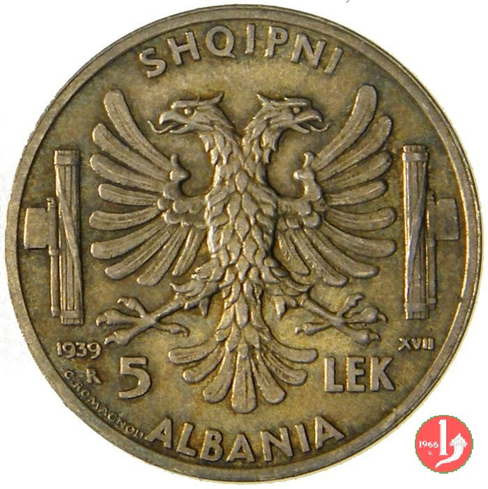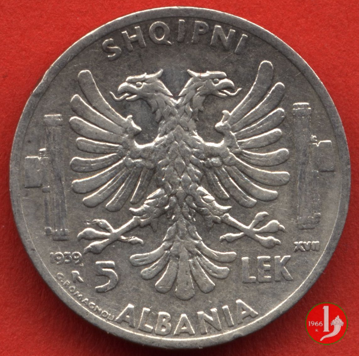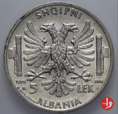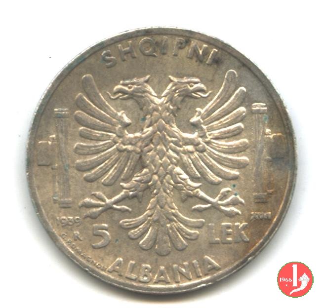 Aquila bicipite albanese contornata da due fasci con le scuri verso l'esterno. Sotto il fascio di sinistra, il millesimo e il segno di zecca (R) su due righe, sotto quello di destra, l'anno dell'Era Fascista. Ai lati della coda dell'aquila, indicazione del valore (5 LEK). Lungo il bordo, in alto SHQIPNI, in basso ALBANIA. Da ore 7 a ore 8 lungo il bordo, indicazione dell'autore (G. ROMAGNOLI). Testa del Re volta a sinistra. Intorno la scritta VITT • EM • III RE E IMP • MBRET E PER •.