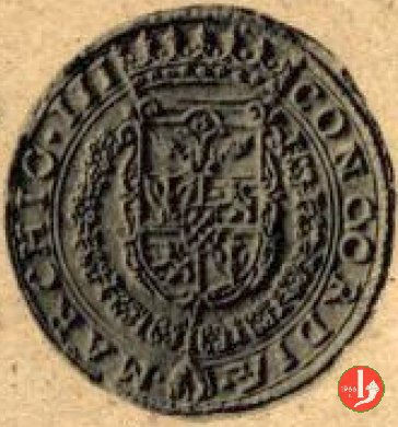 Stemma ornato, inquartato e coronato, caricato da scudetto Pico scaccato e circondato da collare del Toson d'oro.