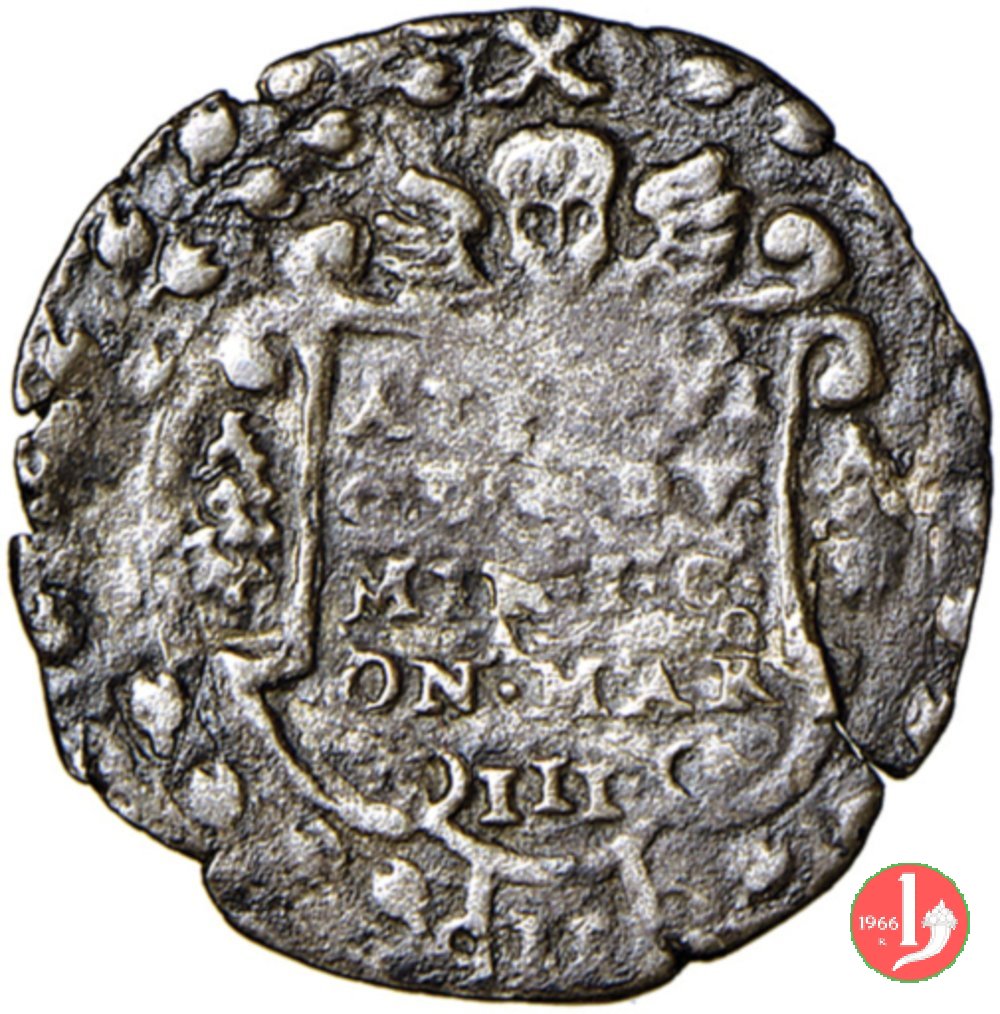 Moneta emessa ad evidente imitazione del 6 grossi di Ferdinando Gonzaga per Casale Monferrato. Moneta inedita ed assente da tutti i testi numismatici di riferimento, apparsa per la prima volta sul mercato nel novembre 2016 all'asta Numismatica Picena n. 2. Il valore di 6 grossi che intendeva imitare la moneta è del tutto indicativo; nella parte inferiore del dritto della moneta, dove sull'originale è presente la cifra 6 (grossi) in cartella ovale, pare di intravedere una coppia di caratteri o cifre che però, a causa della scarsa conservazione dell'unico esemplare apparso sul mercato, sono di difficile interpretazione.