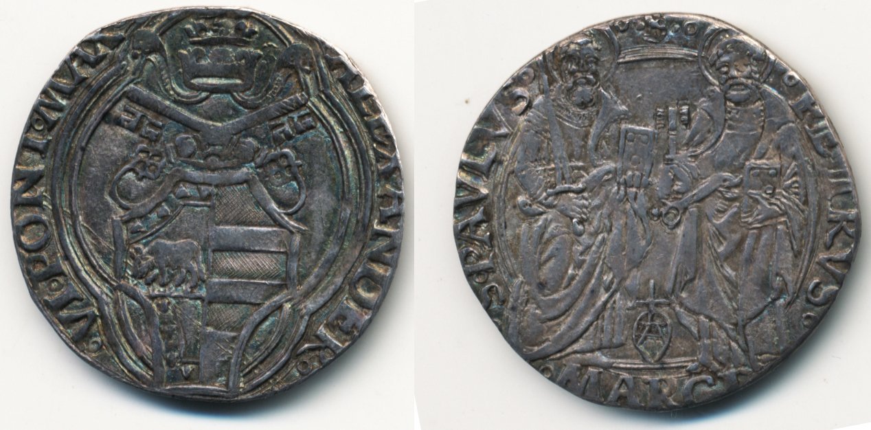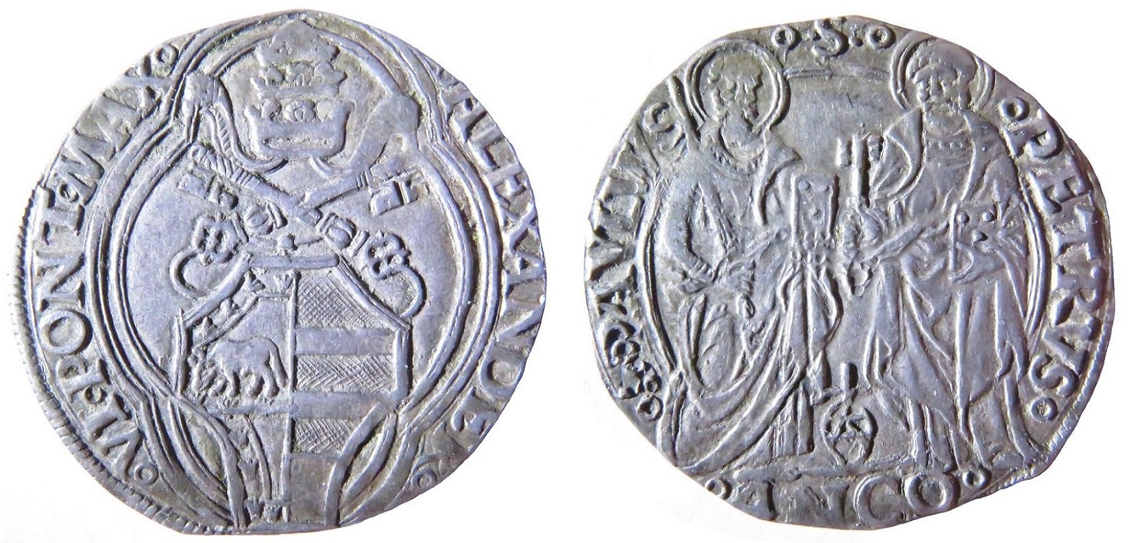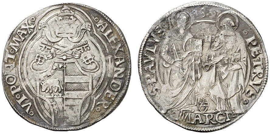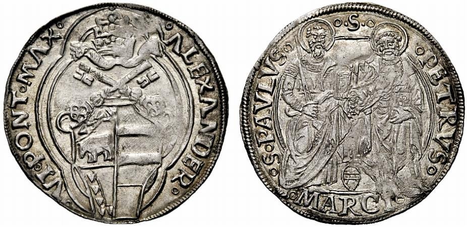 13 D/°ALEXANDER°__°VI°PONT°MAX° (le due N rovesciate) R/°S:PAVLVS°_°.S.°PETRVS° in Esergo: °MARCI°