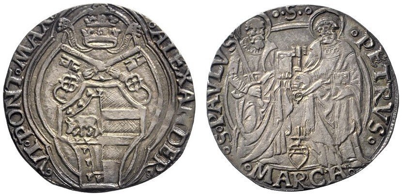 12 D/.ALEXANDER.__.VI.PONT.MAX (N di Alexander rovesciata) R/°S°PAVLVS°.S.°_°PETRVS° in Esergo: °MARCA°