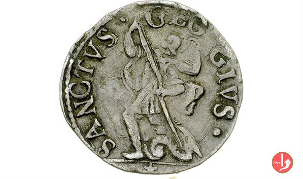 San Giorgio a piedi, di fronte, trafigge il drago. In esergo • stella a 5 punte