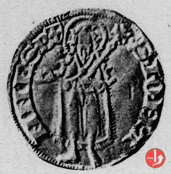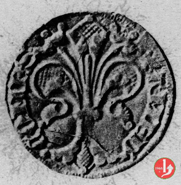 Grande giglio fiorentino, intorno: croce AMED COMES Santo benedicente in piedi con un mantello di pelliccia che regge la croce con la sinistra, intorno S IOHA NNES B scudetto sabaudo