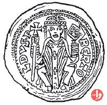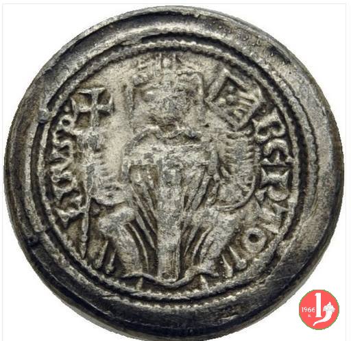 BЄRTOLDVS P, il patriarca, seduto in faldistorio, con mitria e pianeta ornata da globetti. Regge con la mano destra croce e con la sinistra libro. Doppio contorno perlinato. +.CIVITAS.AQVILЄGIA. Busto della Vergine frontale, nimbato e velato. Mani rivolte in preghiera. Libro con 4 borchie. Contorno perlinato.