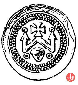 + •BERTOTOLDVS.P. Il patriarca con veste dalmatica Frontone di tempio con torri, sotto testa