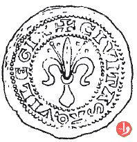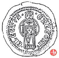 (globetto) GRЄGORI' (globetto) (globetto) ЄLЄCTVS (globetto), il patriarca stante che con le mani regge un libro ornato da globetti. Doppio contorno perlinato. + CIVITAS(S "coricata")AQVILЄGIA, Giglio con due trifogli negli angoli. Contorno perlinato