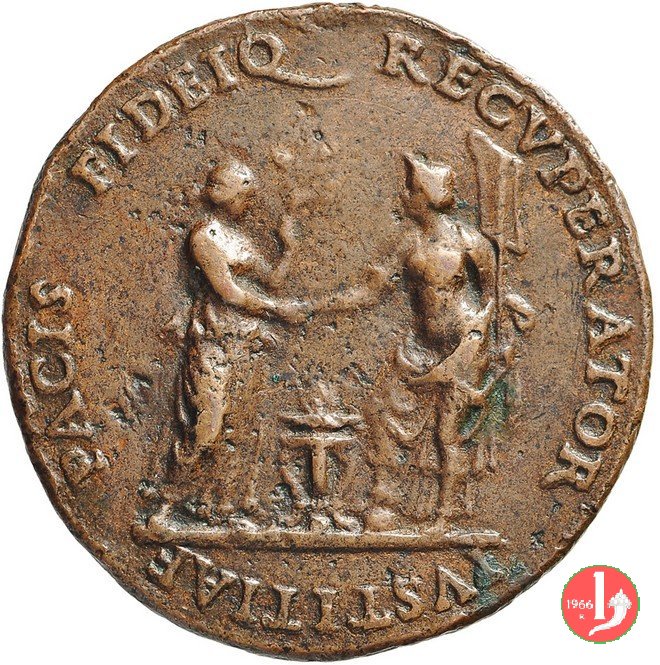 Le figure allegoriche della pace con ramo d'ulivo e della fortuna con timone e piede su piccolo globo, si stringono la mano