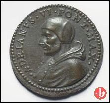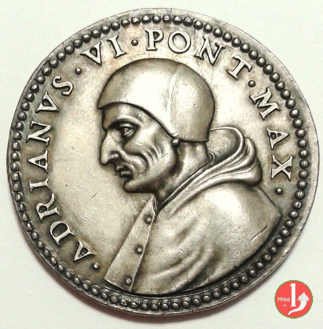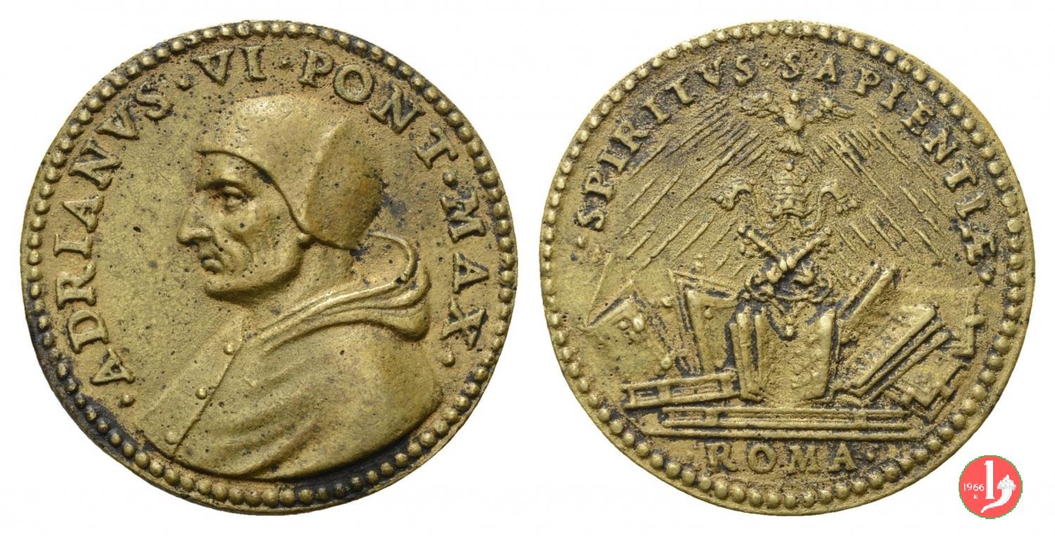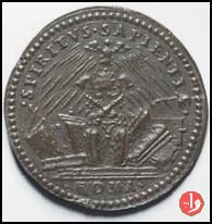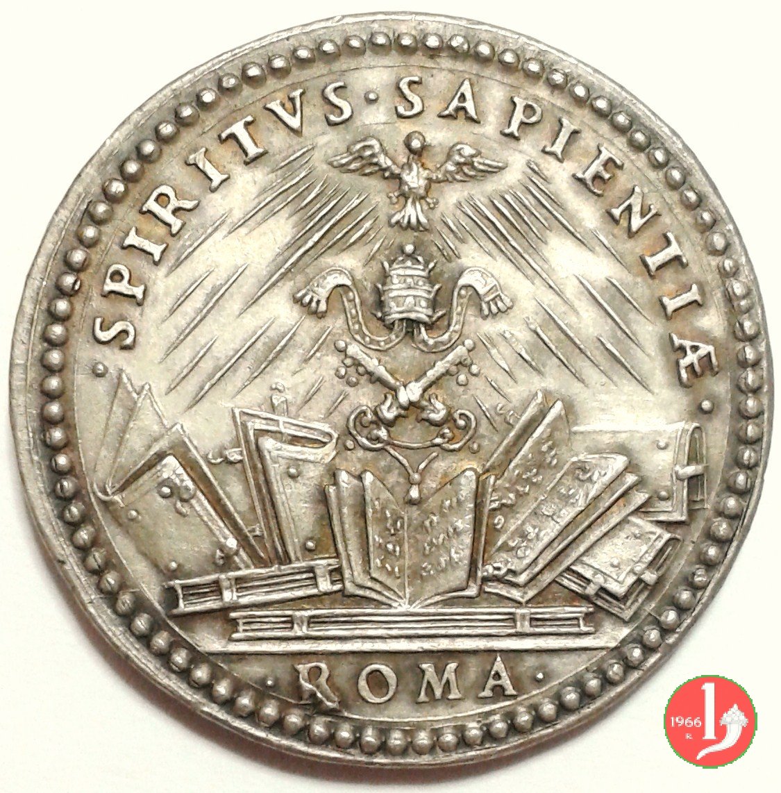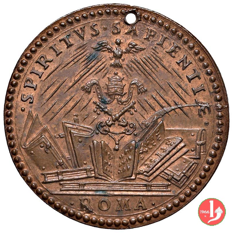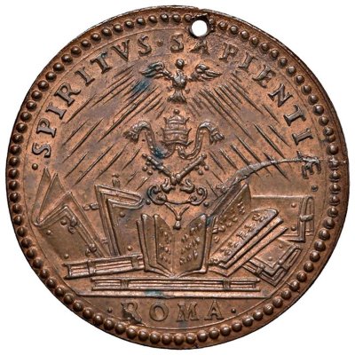 Medaglia di restituzione coniata, realizzata a metà del XVII secolo, commemorativa della grande cultura del Pontefice. Esemplare originale. Il conio del diritto perviene al Mazio con significative fratture. Il conio del rovescio fu rifatto e presenta differenze rispetto all'originale in particolare nella disposizione dei raggi della colomba al Verso (vedi successiva). | ||||||