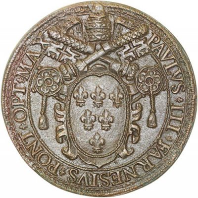 Medaglia straordinaria fusa, emessa nel 1575. Modesti al n. 372 descrive una medaglia con questo D/ emessa per ricordare il completamento del Monumento funebre a Paolo III.  | ||||||||||||||