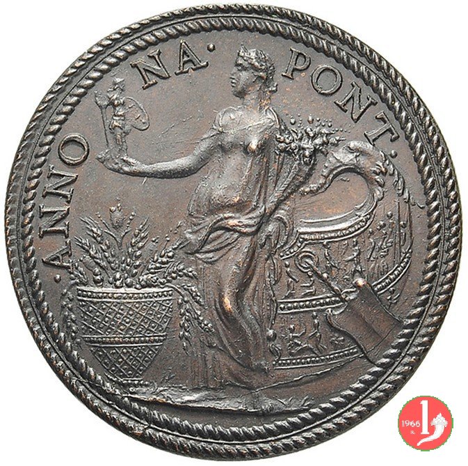 la figura allegorica dell'Annona in piedi, velata e volta a sx, regge statuetta della fortuna e cornucopia floreale, davanti a lei cesto con spighe, in basso a dx timone esce da poppa di nave con decorate scene in due file e contornate di bordi perlinati
