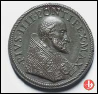 Medaglia riconio, realizzata tra la fine del XVII e l'inizio del XVIII secolo da Hamerani e nel XIX secolo da Mazio, emessa a ricordo della costruzione della chiesta di Santa Maria degli Angeli a Roma. Qui al V, l'aureola della B. V., tocca due lettere della legenda (S • V). La coniazione del XIX secolo Mazio è distinguibile per le patine piú scure. | |||||||||||||||||