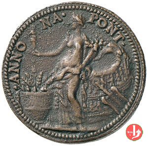 L'annona in piedi verso sx regge cornucopia, timone e vittoria, sullo sfondo a sx cesto di prodotti