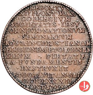 . GREGORIVS = • XIII • PONT • MAX = • COLLEGIVM = • SOCIETATIS • IESV = • OMNIVM • NATIONVM = PRO • SVA • IN • CHRISTIANAM • = RELIGIONEM • ET • ORINEM = • ILLVM • PIETATE = • A • FVNDAMENTIS = • EXTRVXIT = • ET • DOTAVIT • AN • SAL • = CI LXXXII= • PONT • SVI = • ROMAE •