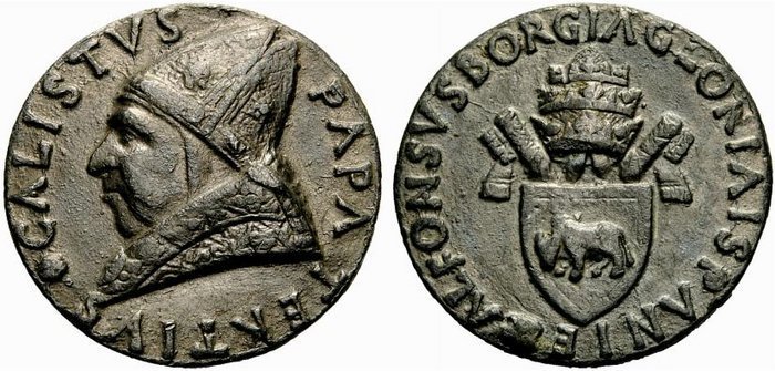 | Medaglia fusa, emessa nel 1455 per ricordare l'elezione al Pontificato di Alfonso Borgia (1378-1458) con il nome di Callisto III. | |||||||||||||||||