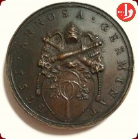 Medaglia di restituzione, realizzata verso la fine del XVII secolo. Stemma leggermente piú piccolo delle successive Mo 143-144, generalmente presenta una frattura a sx del triregno. | ||||||||||||||||