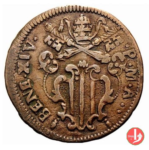 8 D/: Stemma sagomato con punta a destra, chiavi con impugnatura ovale fogliata, con fiocchi. Legenda da SX: BENEDICTV - XIV • P • M • A • anno di pontificato •