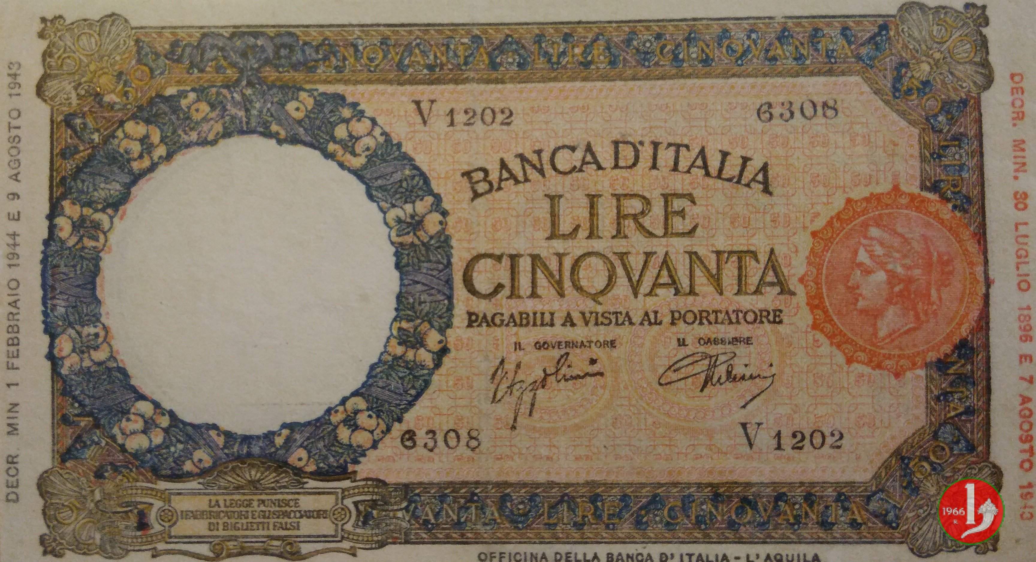 Il D.M. del 22-05-1942 - anno XX, che compare sulle banconote, indica l'introduzione della scritta "Officine della Banca d'Italia - L'Aquila".