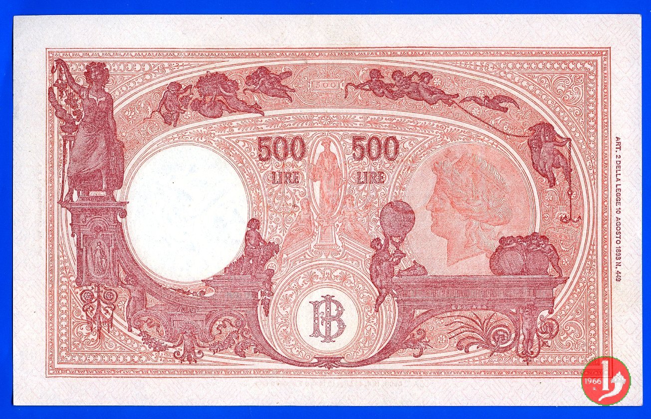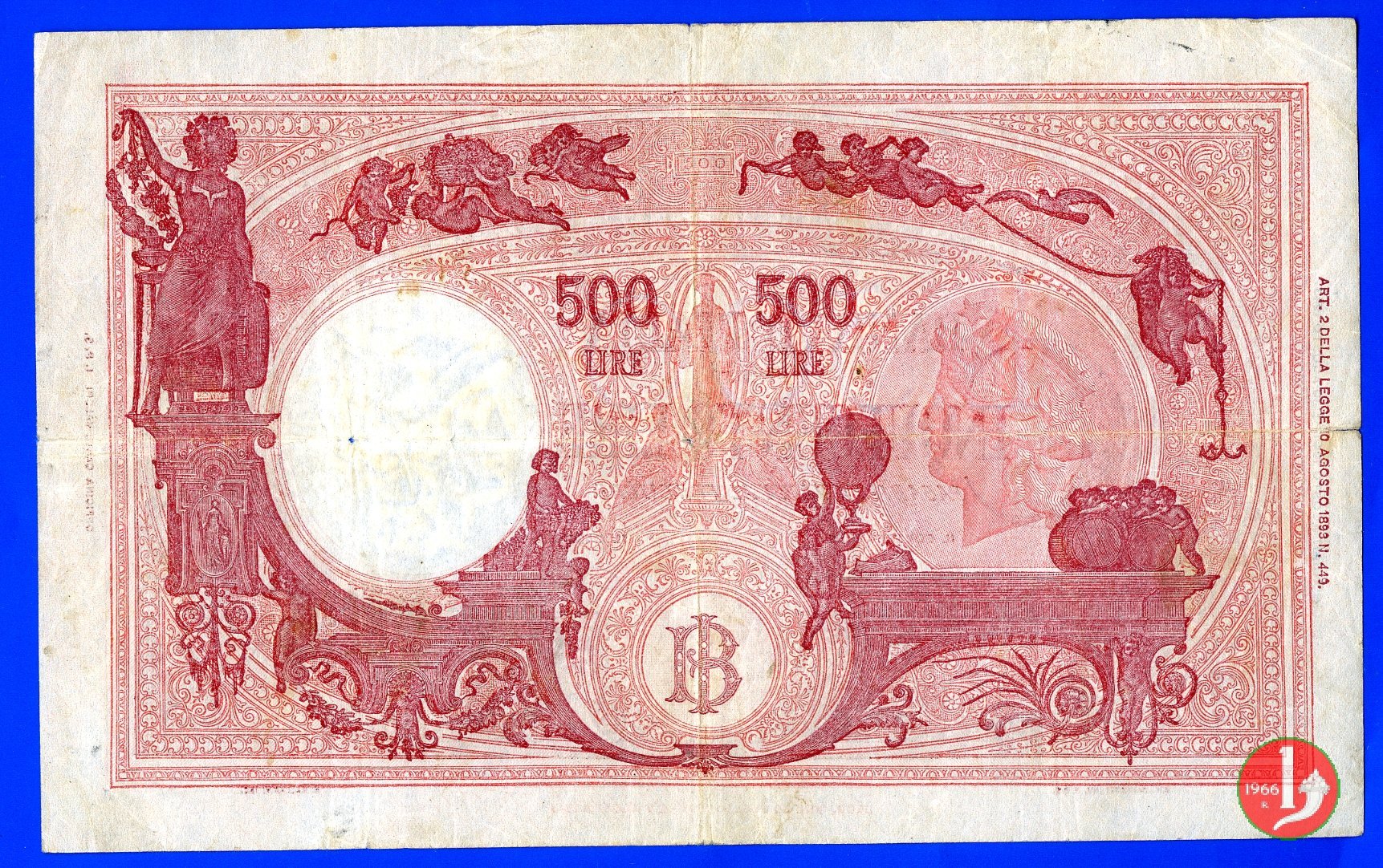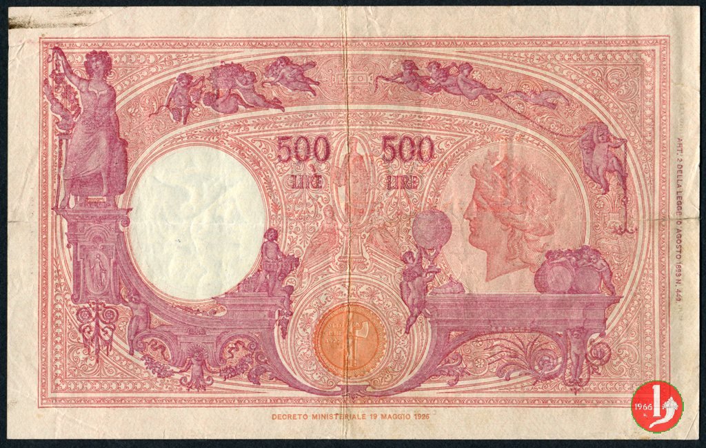 Filigrana: Nell'ovale testa di Roma emlata con aletta; nel centro del biglietto "L.500".