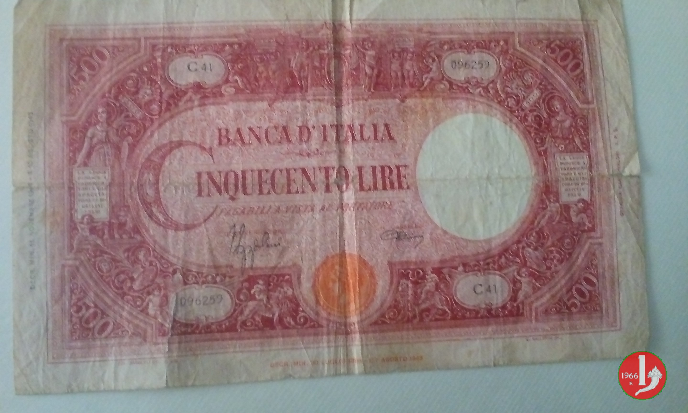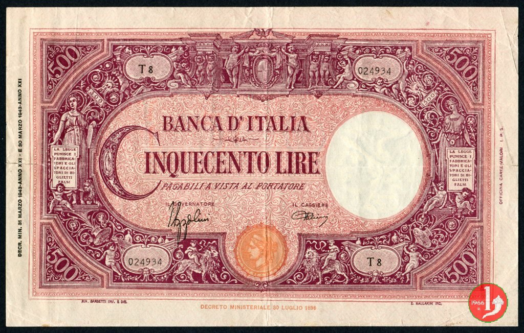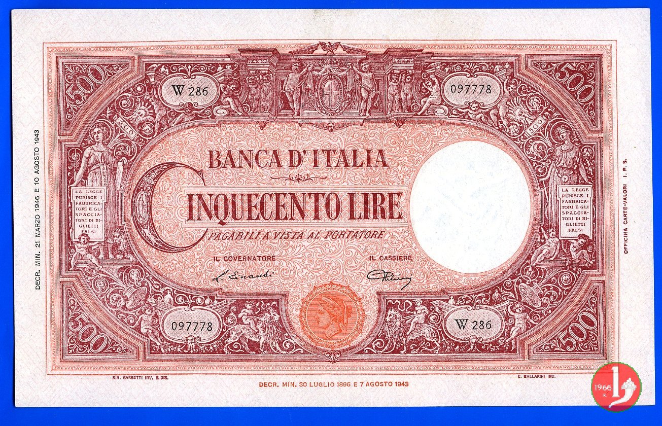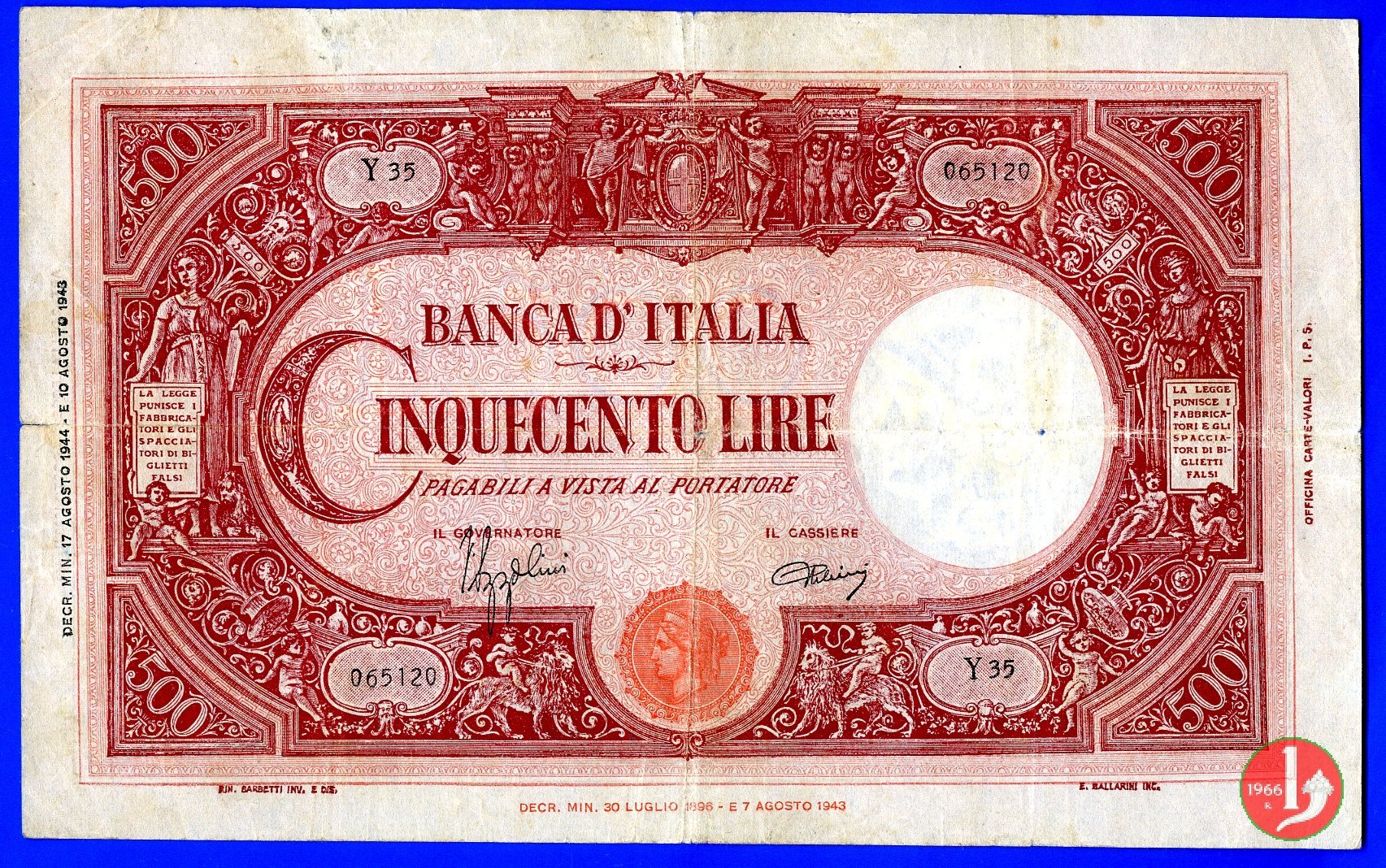 Filigrana: Nell'ovale testa di Roma emlata con aletta; nel centro del biglietto "L.500".