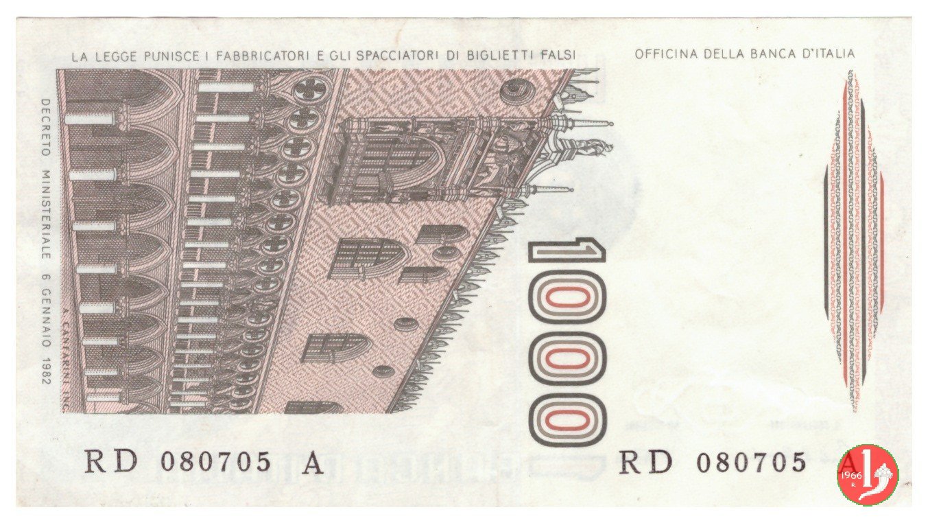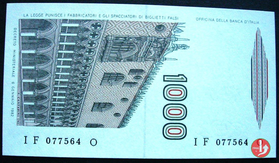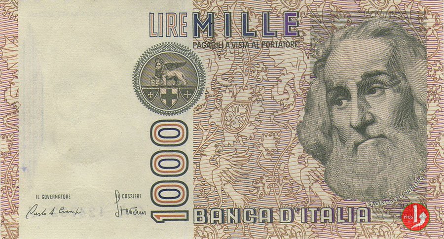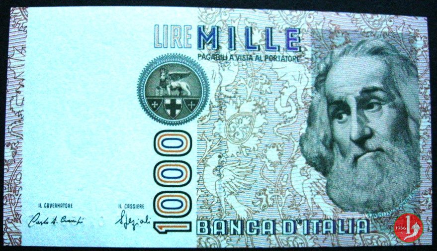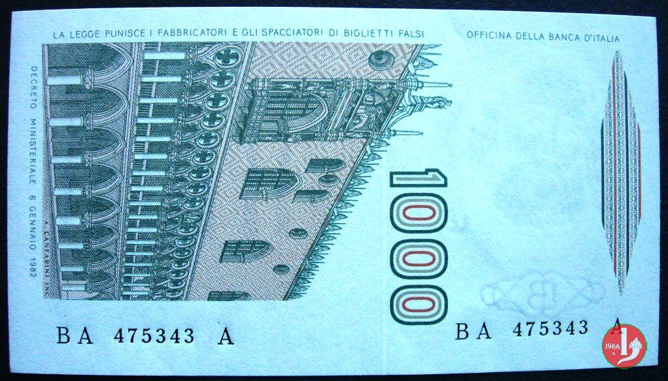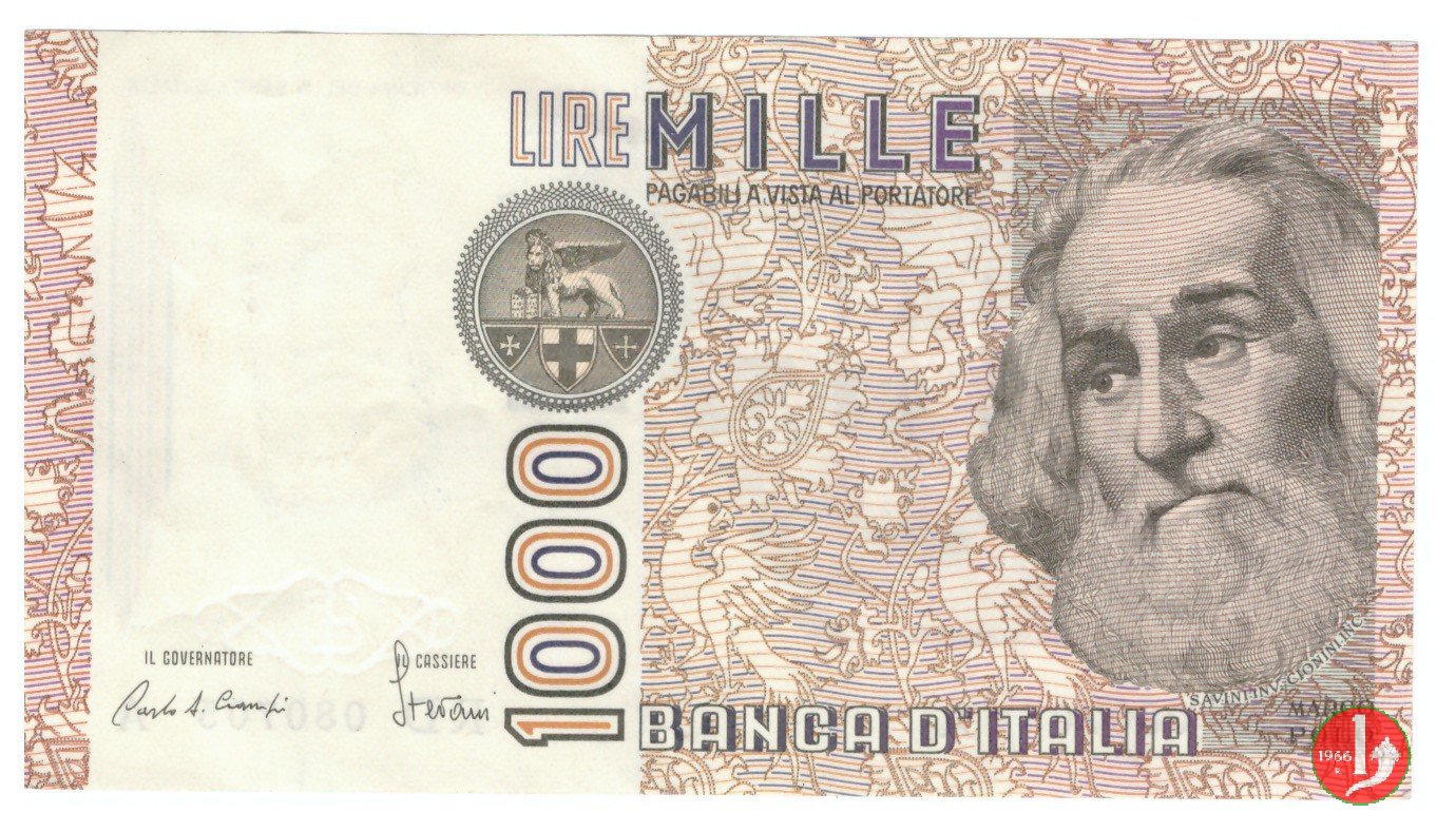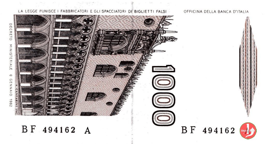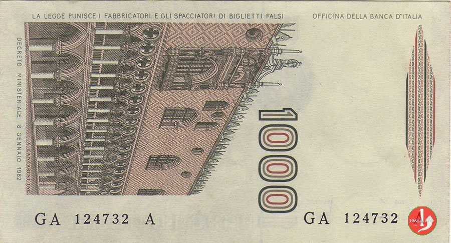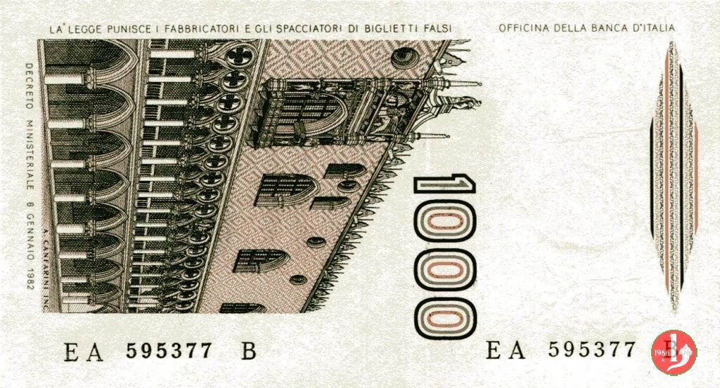 1 A partire dalla tipologia del 1.000 lire "Marco Polo" del 1982, il decreto d'emissione non compare piú sulle banconote della Banca d'Italia. Il decreto è sostituito dalla seconda lettera alfabetica della composizione alfanumerica del numero di serie. Questa nuova impostazione crea una rarità nella produzione della prima serie realativa alla prima data d'emissione; infatti, soltanto il primo milione di pezzi, tiratura delle singole serie, può avere la sigla AA...A.
