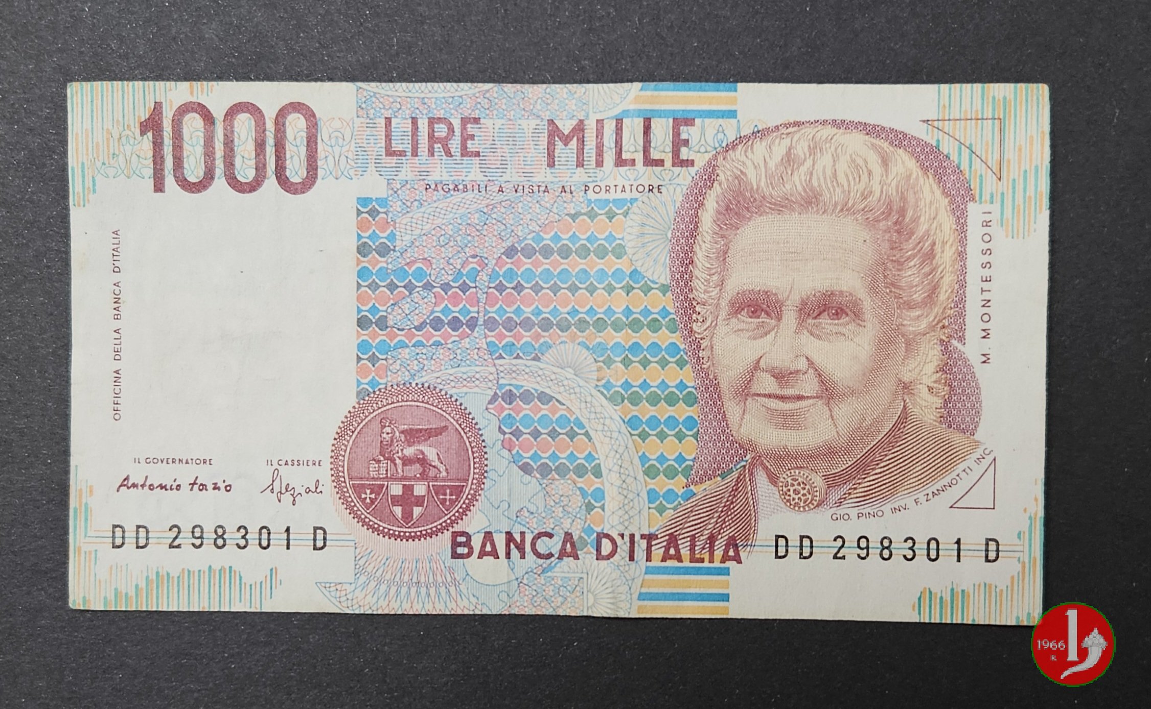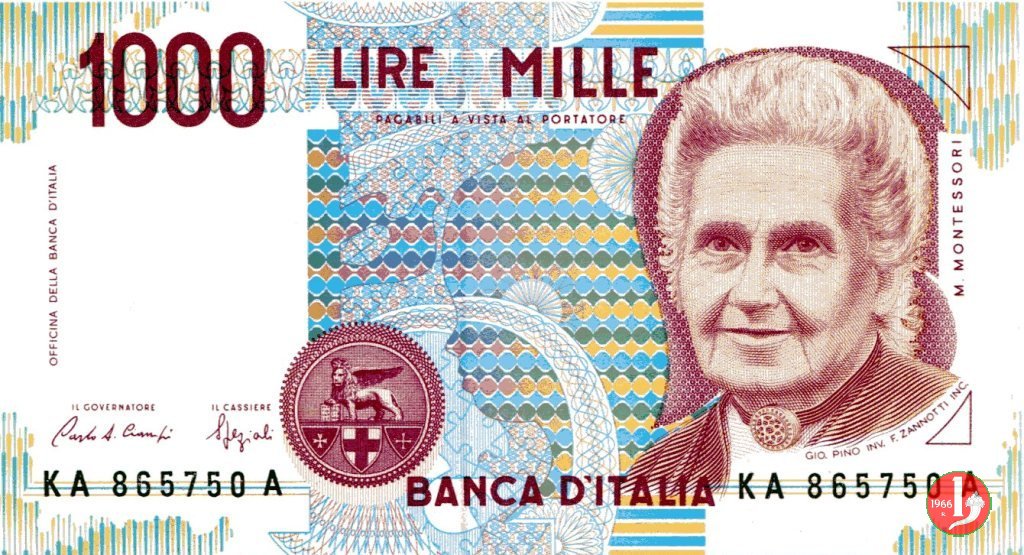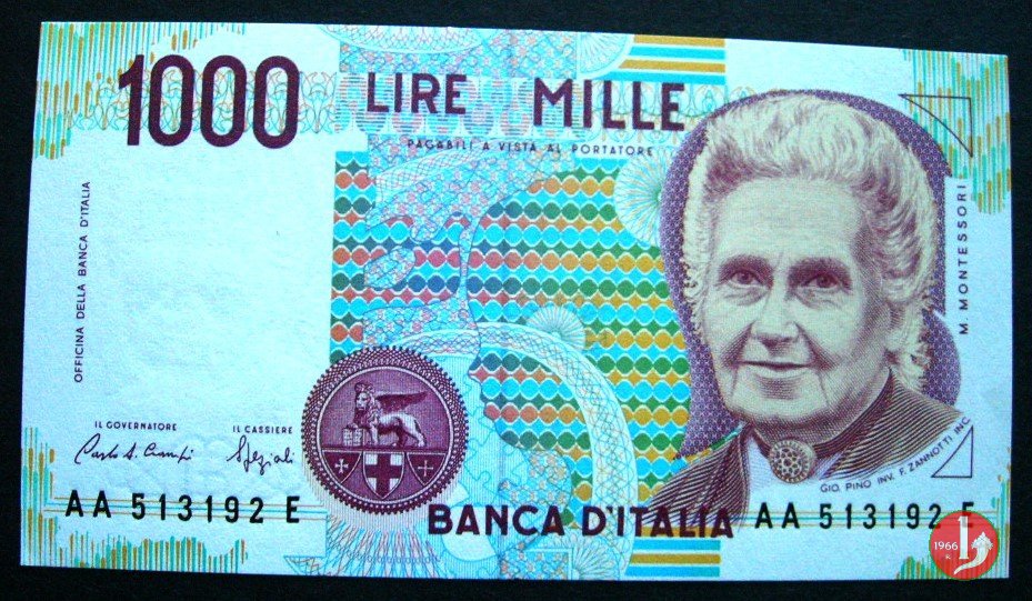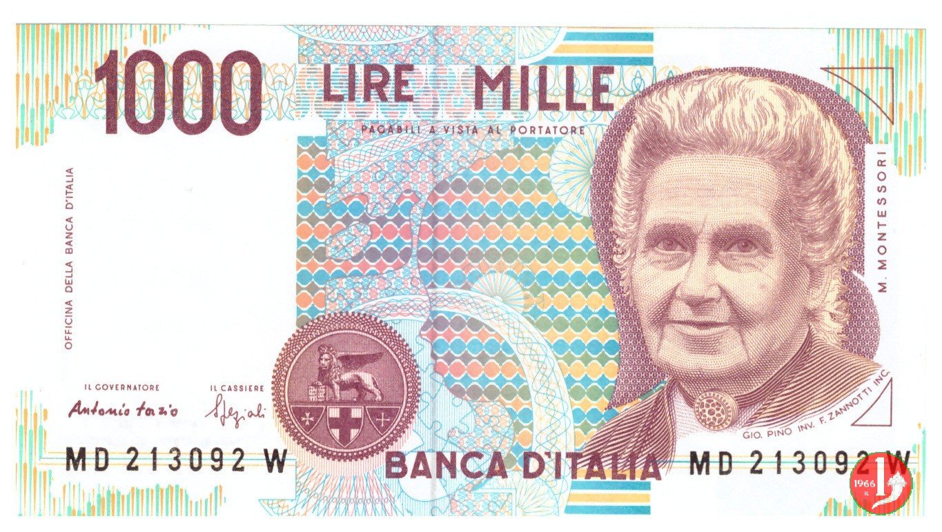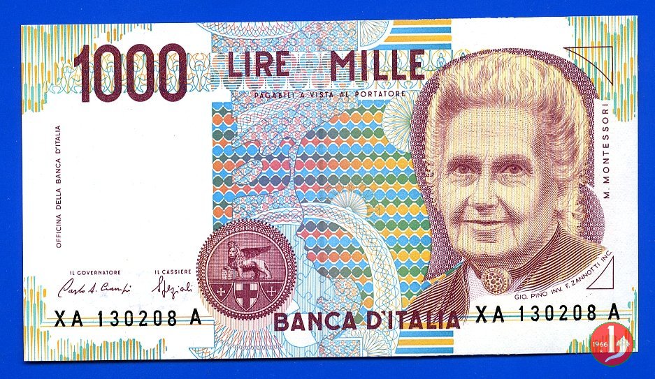 Per la prima volta nelle emissioni della Banca d'Italia, viene effigiato, su una banconota, un personaggio illustre del XX secolo. La Montessori, una delle prime donne laureatsi in medicina, in Italia, è stata inoltre, la prima donna ad ingentilire, una banconota del nostro istituto di emissione. Contrassegno di stato: Leone di San Marco e Repubbliche Marinare. Tutte le emissioni sono stampate su carta contenente fibrille fluorescenti e contengono un filo metallico di sicurezza interno, posto verticalmente. Ogni serie è composta da 1.000.000 pezzi. | ||||||||||||||