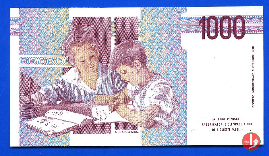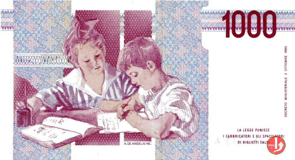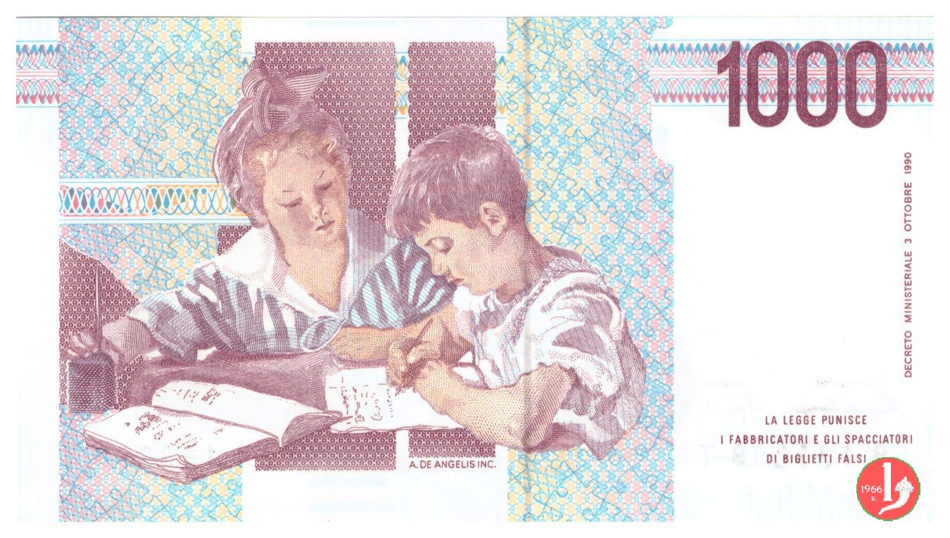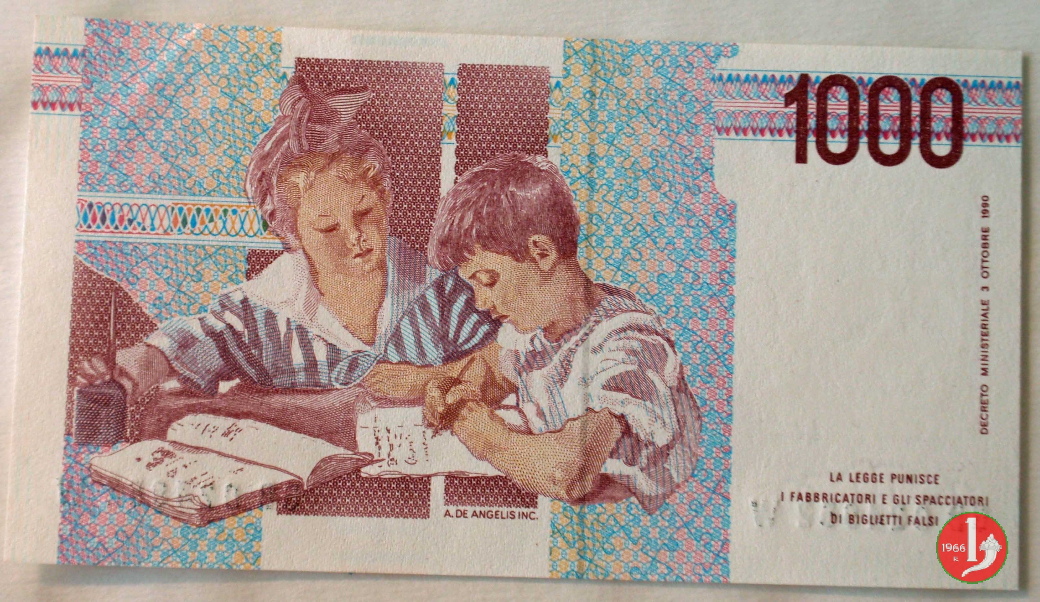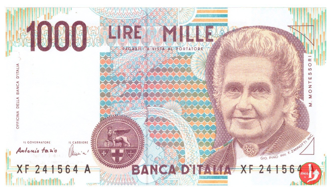 Per la prima volta nelle emissioni della Banca d'Italia, viene effigiato, su una banconota, un personaggio illustre del XX secolo. La Montessori, una delle prime donne laureatsi in medicina, in Italia, è stata inoltre, la prima donna ad ingentilire, una banconota del nostro istituto di emissione. Contrassegno di stato: Leone di San Marco e Repubbliche Marinare. Tutte le emissioni sono stampate su carta contenente fibrille fluorescenti e contengono un filo metallico di sicurezza interno, posto verticalmente. Ogni serie è composta da 1.000.000 pezzi. | ||||||||||||||