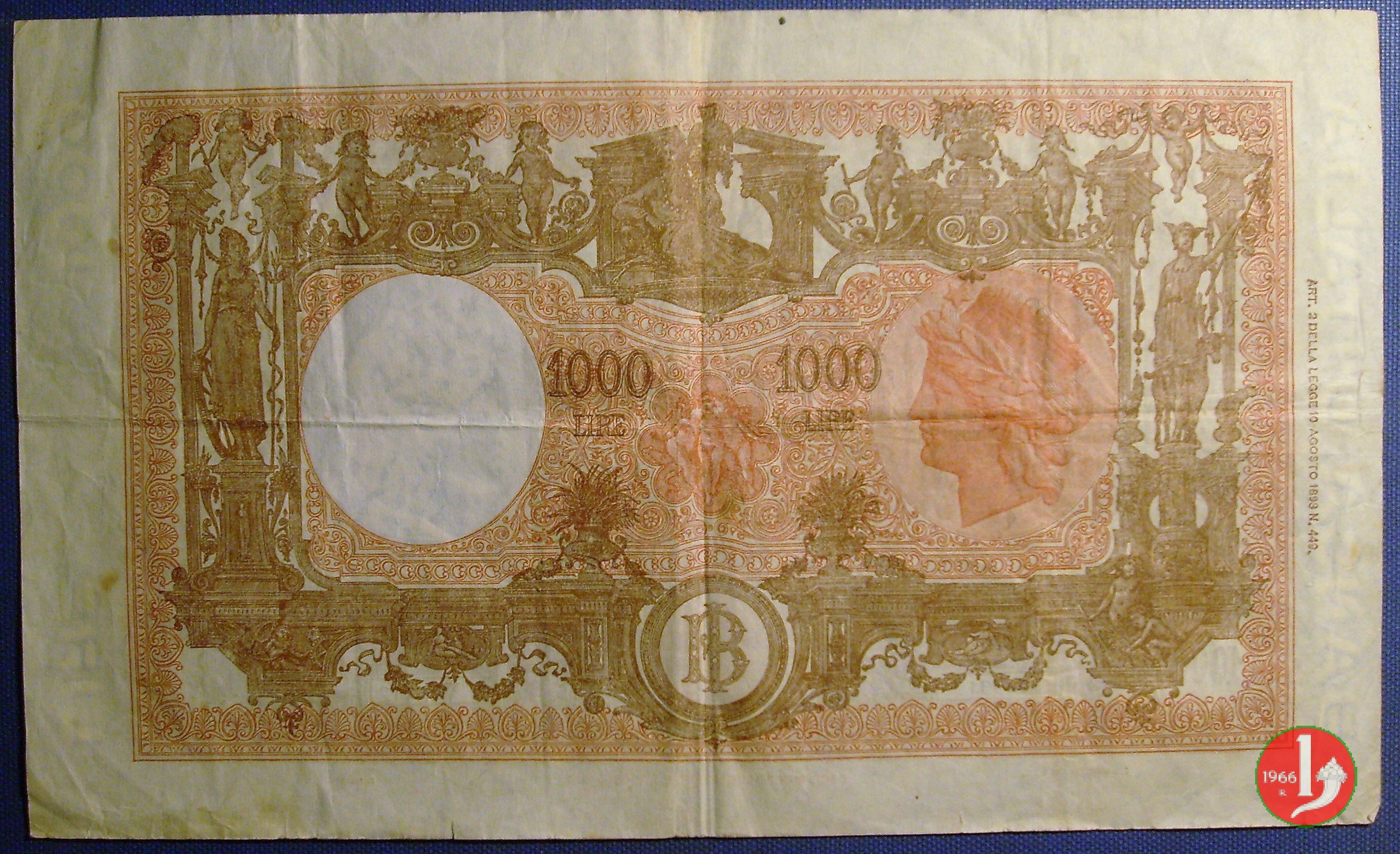 | Filigrana: Nell'ovale testa d'Italia turrita con stella, nel bordo verticale sinistro "BANCA D'ITALIA", in quello destro "LIRE 1000". | ||||||||||