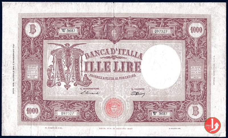 | 1947 Serie ordinaria 21/03/19471 | W-BRI/36-6 | W2581 - 000001 W2780 - 100000 | Luigi Enaudi Urbini | C | 20 000 000 | |||||