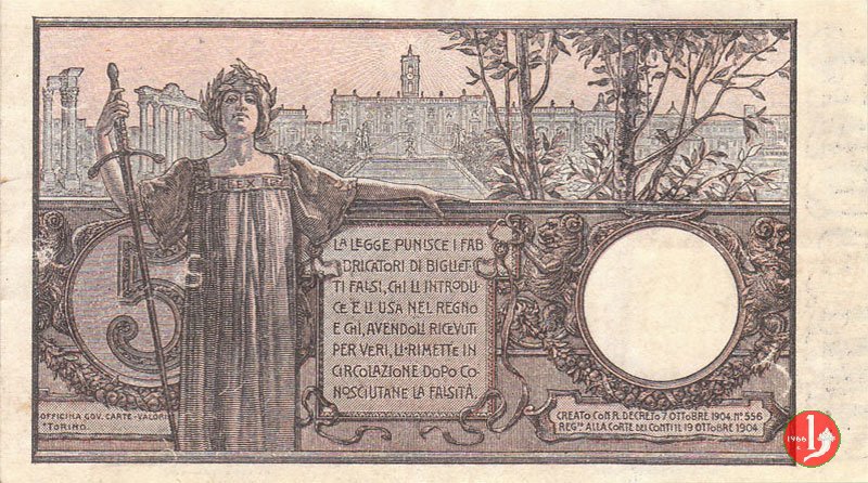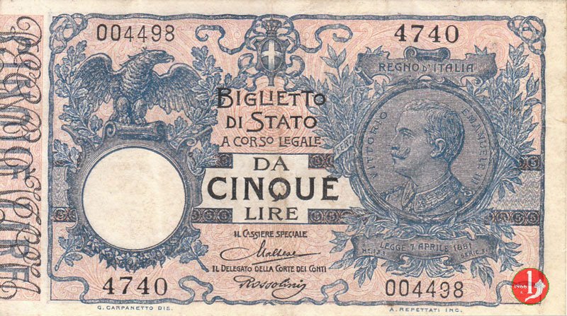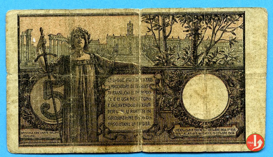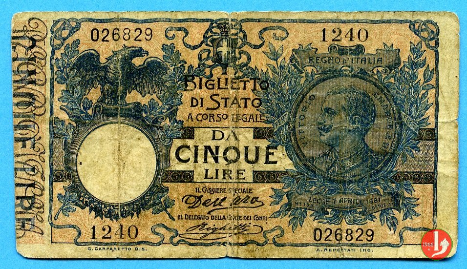 Nel lato sinistro del biglietto, Matrice con la scritta "CINQUE LIRE".