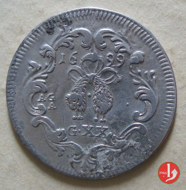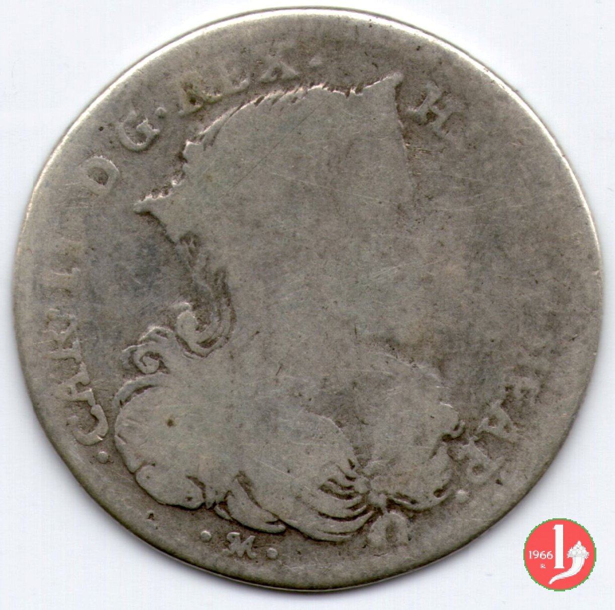 .CAR • II • DG • REX • •HISP • ET • NEAP • Busto coronato del re a dx, sotto •IM. • Data divisa in due dal nastro che sorregge il tosone. Tosone volto a sx, a sx AG/A, a dx punto, sotto G • XX.