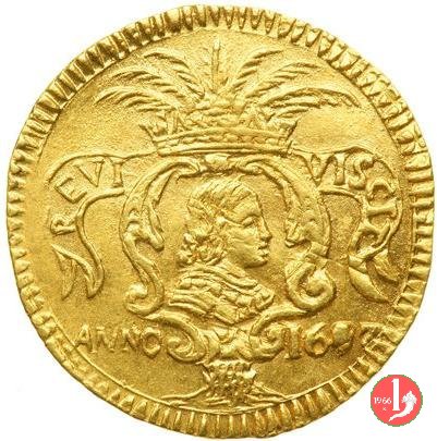 R REVIVISCIT Trad. RIVIVE Lo scudo d'oro tornava ad essere battuto dopo oltre un secolo e mezzo dai primi scudi aurei o trionfi di Carlo V e Filippo II di Spagna (1557). Questa moneta venne coniata per celebrare la ritrovata salute del sovrano. Esistono esemplari con sette e nove rami di palma. | |||||||||
