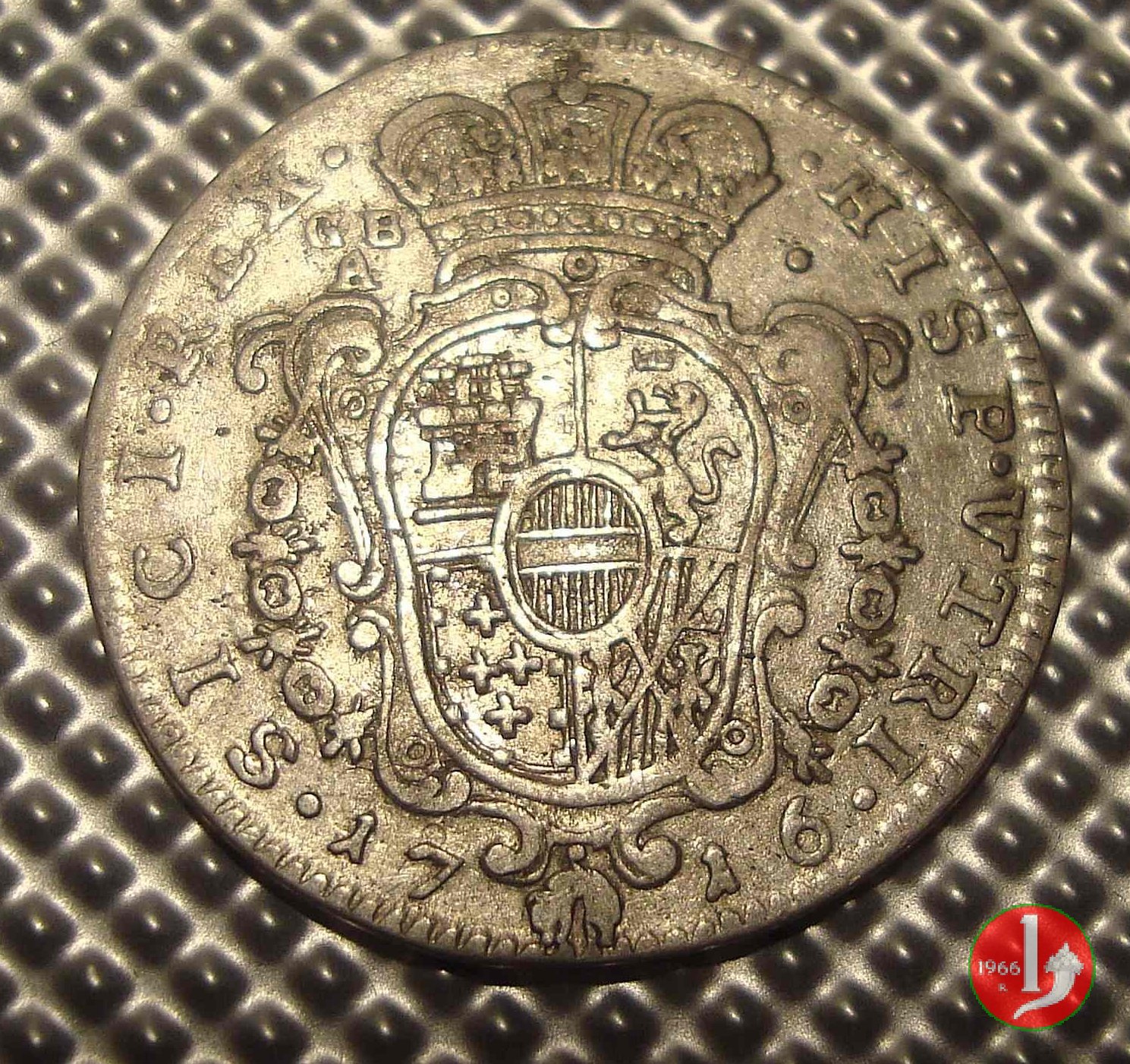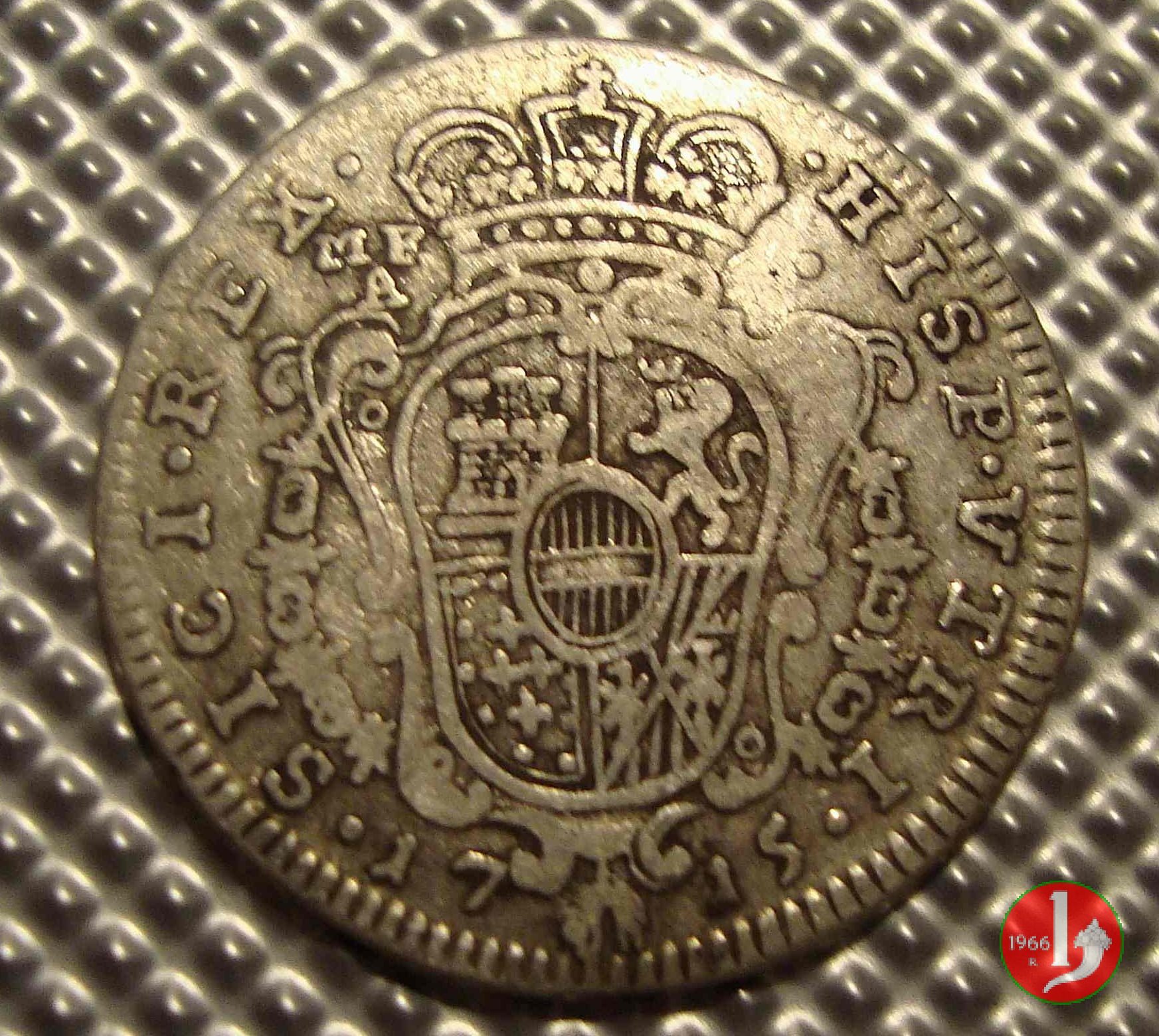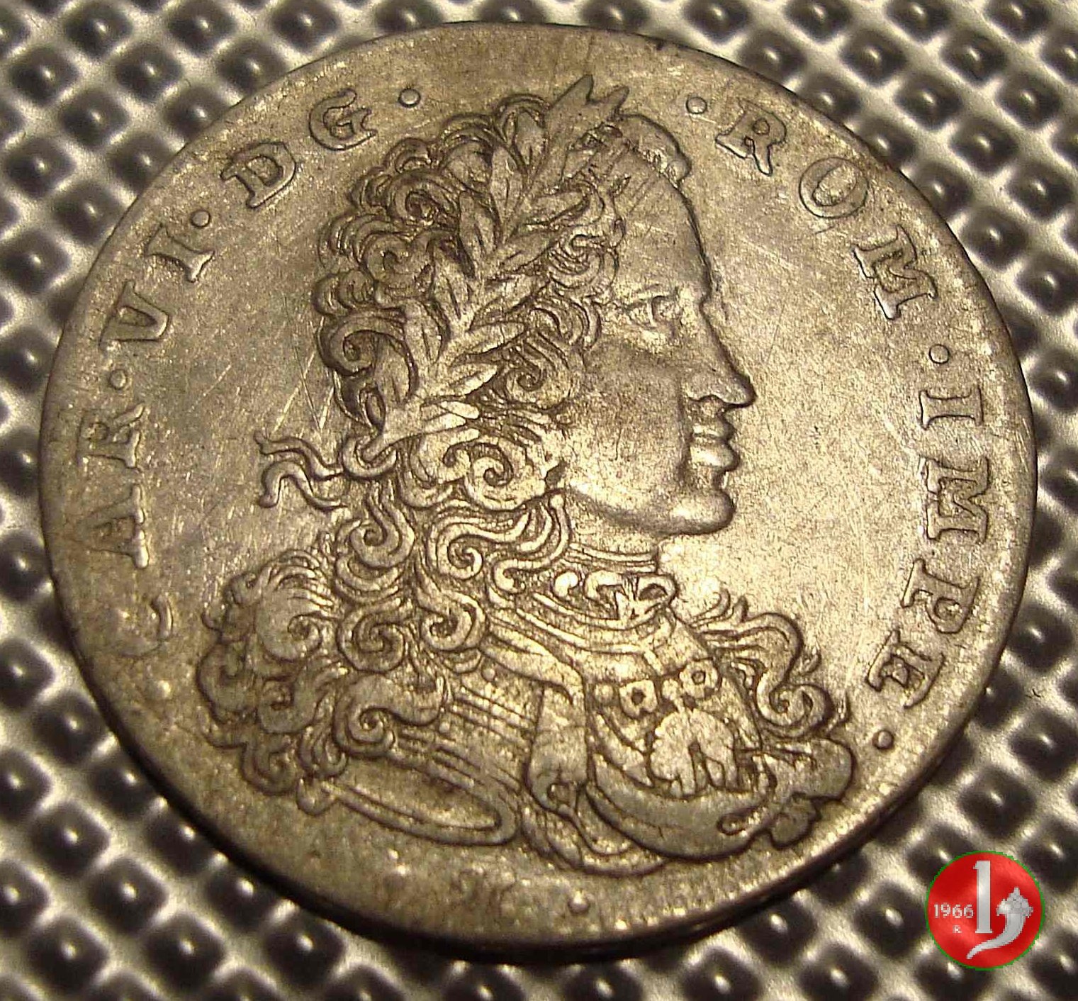 CAR VI D G ROM IMPE, Busto laureato dell'imperatore a dx, nel taglio del braccio IM. HISP VTRI SICI REX, Stemma coronato in cartocci con parte del collare del Toson d'oro , a sx della corona sigle zecchieri, sotto la data.