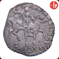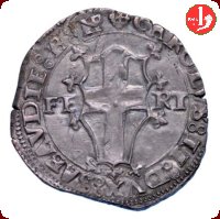 Scudo sabaudo a testa di cavallo con dei trifogli alle punte e ai fianchi la scritta FE RT, intorno: croce CAROLUS : II : DUX : SABAUDIE : sigle San Maurizio a cavallo rivolto a destra con in mano un vessillo, intorno SANCTUS • MAURICIUS