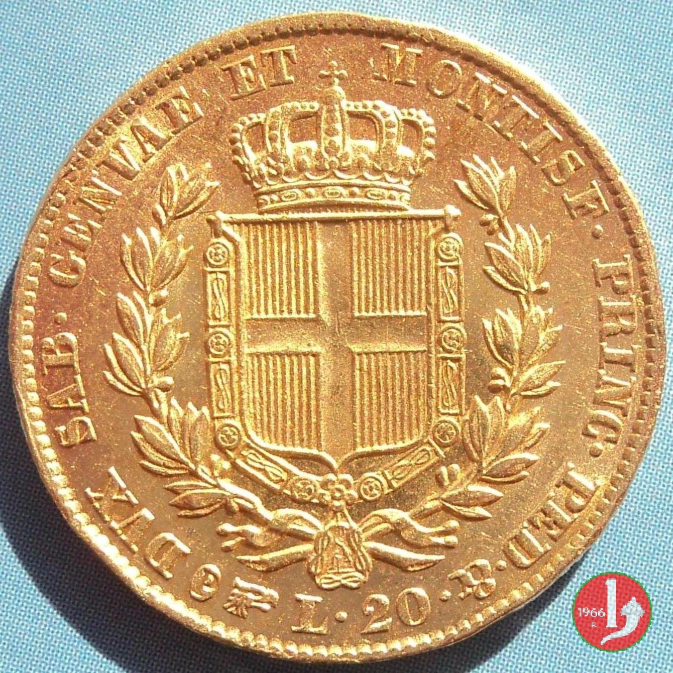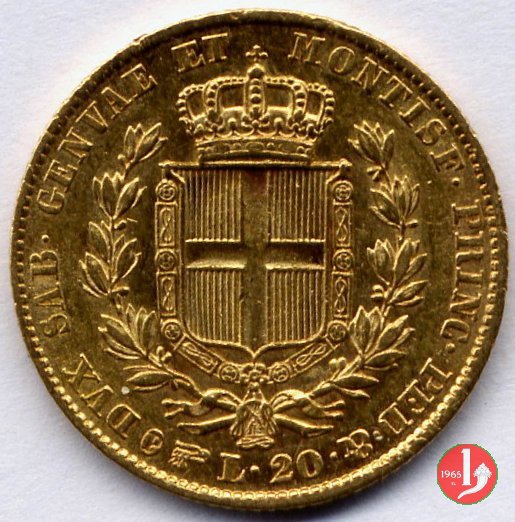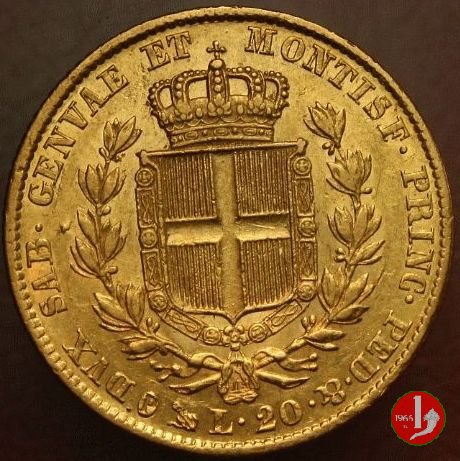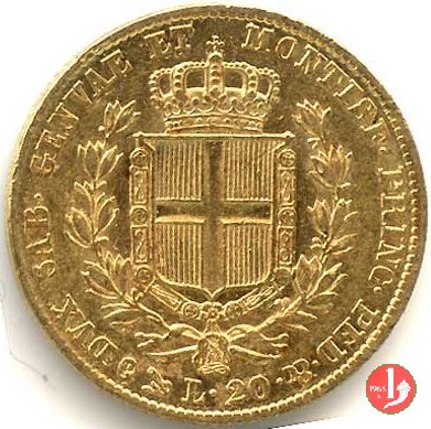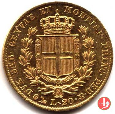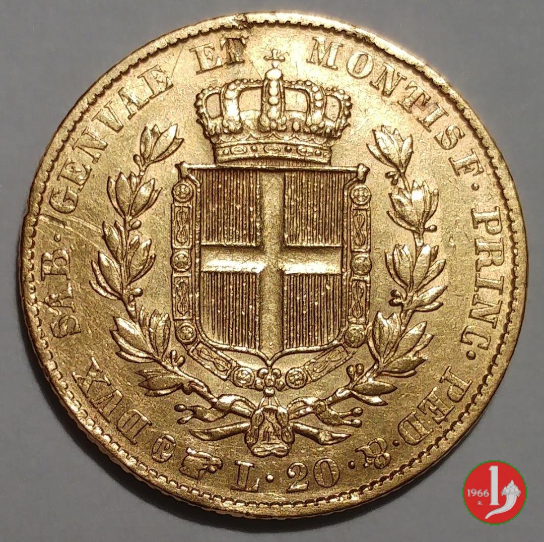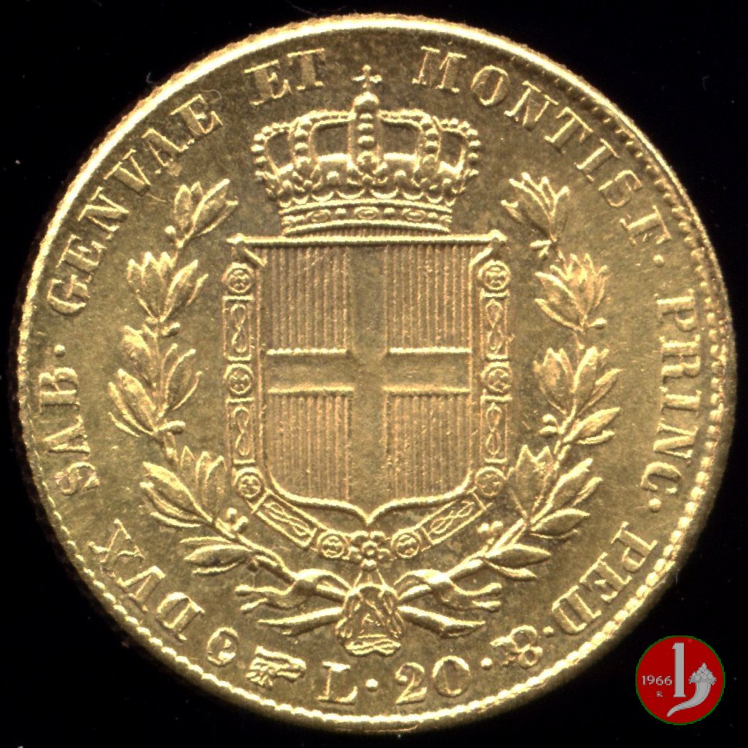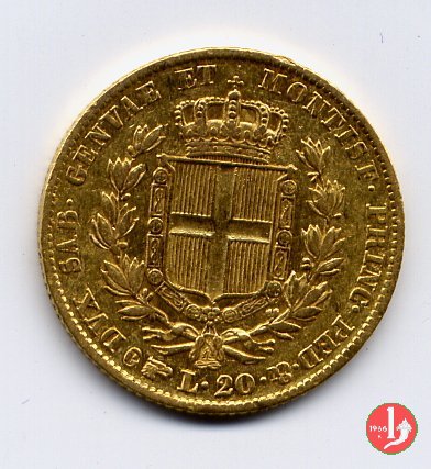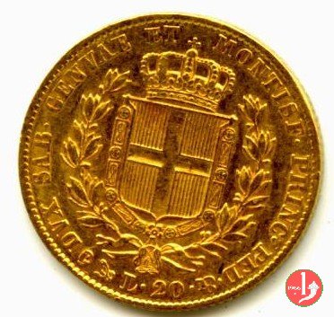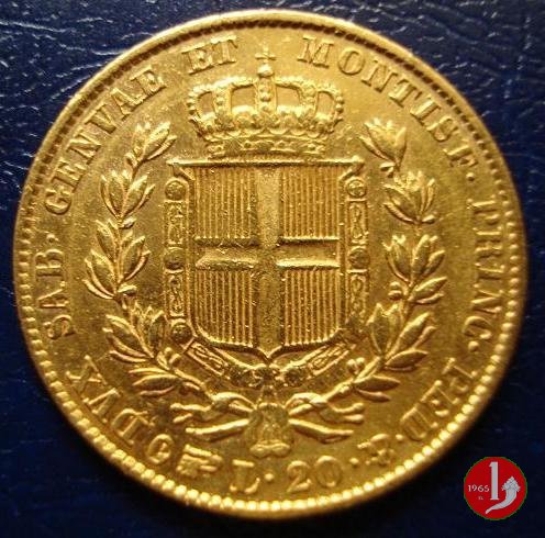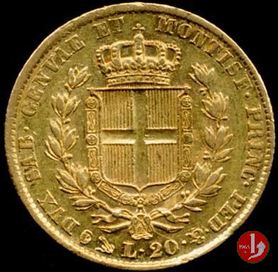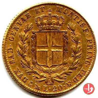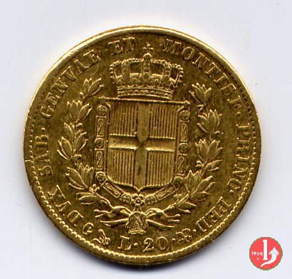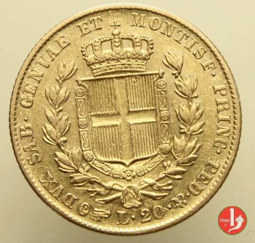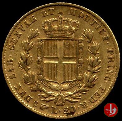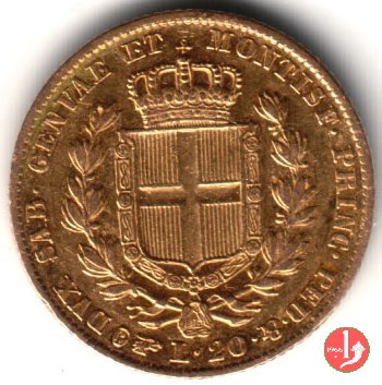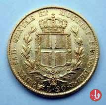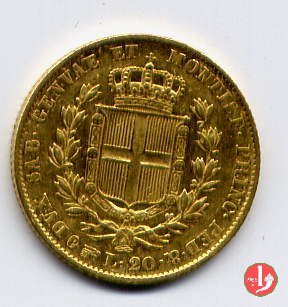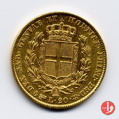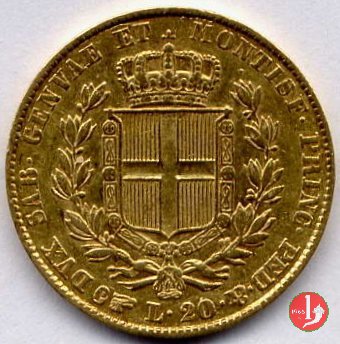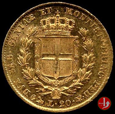 Testa del Re a sinistra, al di sotto della quale si trova il millesimo. Lungo il bordo, CAR • ALBERTVS D • G • REX SARD • CYP • ET HIER •. Sul taglio del collo indicazione dell'autore (F per Ferraris). Stemma con croce Sabauda sovrastato da Corona Reale e fregiato dal collare dell'Annunziata tra rami di lauro. Lungo il bordo: DVX SAB • GENVAE ET MONTISF • PRINC • PED • & •. In basso, da sinistra a destra, segno di zecca e indicazione del valore (L • 20).